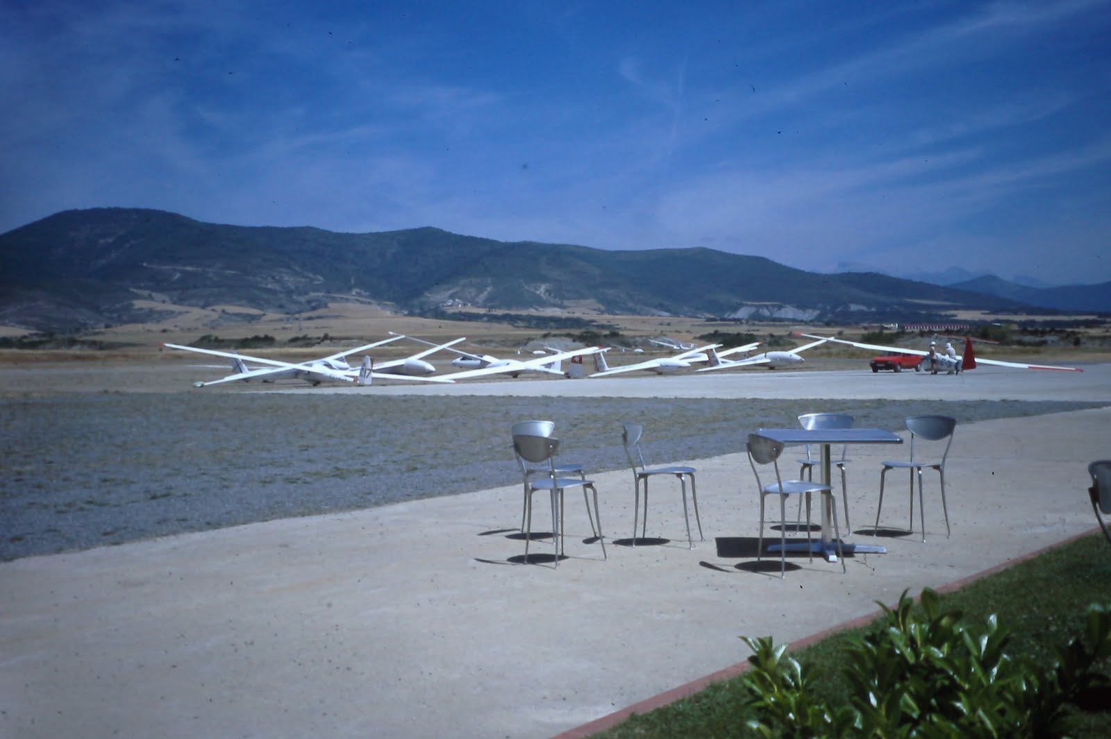 La cafetería del Aeródromo tiene unas magníficas vistas de la pista. Los veleristas comienzan a preparar sus aviones; hacia el mediodía, cuando la actividad térmica vaya tomando fuerza empezará el carrusel de remolques, despegues y aterrizajes