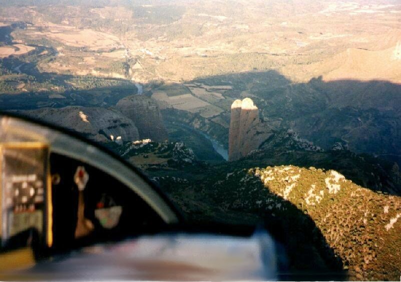 Más alto y más cerca de las cumbres de la Sierra de Telera. Esta es la ocasión que más alto hemos volado mi pájaro y yo, sobre los 3.200 mts (MSL-sobre nivel del mar) Subir hasta aquí y volar manteniendo esta altitud supone un consumo extra de gasolina, el motor rinde menos porque hay una menor cantidad de oxigeno y el ala "flota" menos en el aire al ser éste menos denso, en consecuencia hay que aumentar el régimen de r.p.m del motor y el caudal de combustible, a plenos gases no pasamos de 5000 vueltas de motor, lo que se traduce en un consumo superior a lo habitual. Podríamos decir que son unos efectos análogos al mal de altura en los montañeros, salvando las distancias...bio-mecánicas.