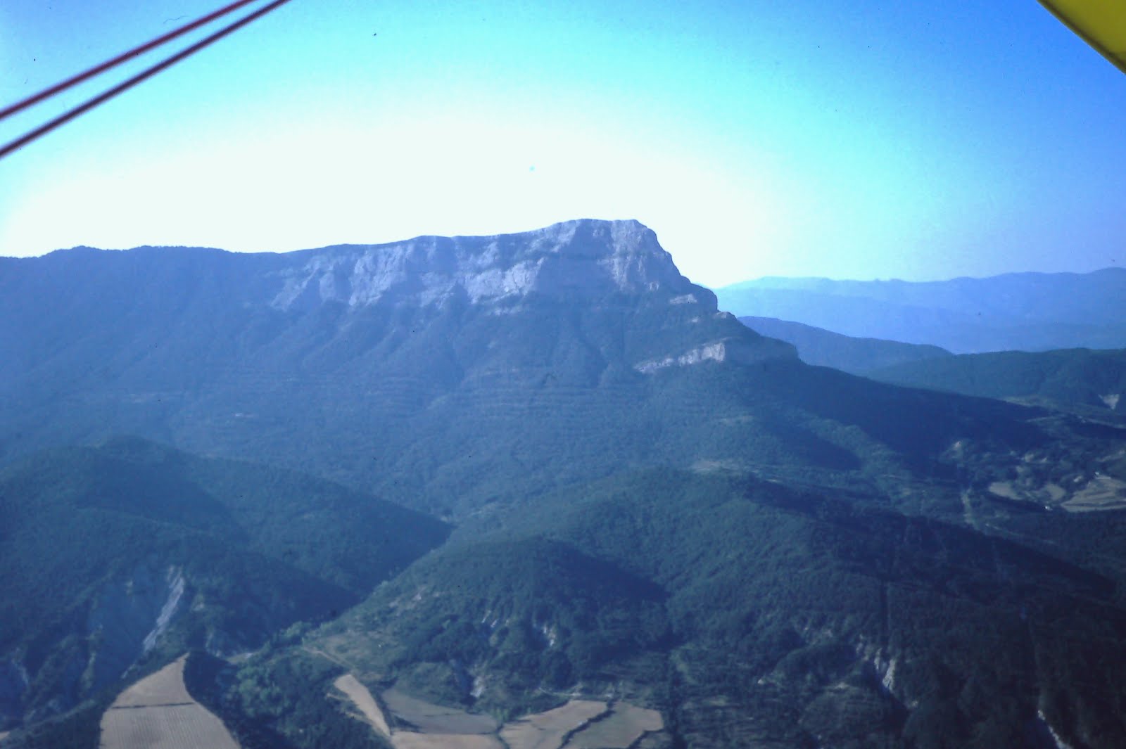 Alzando la vista al Norte nos encontramos con la cadena Pirenaica. A través de valles como el deAnsó o Hecho alcanzaríamos las cumbres de montes como Peñaforca (2.391 mts) y Bisaurín (2.670 mts) que podemos observar al fondo. Hace años escalé sus cimas y en días despejados como el de hoy, contemplando el panorama que se extendía a mis pies....... soñaba que volaba.