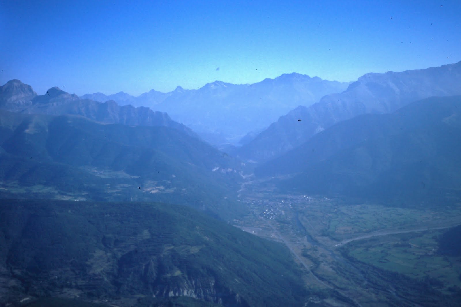 Mi rumbo actual es Norte (360º) y frente al morro del aparato y en lento ascenso por encima de los 2.500 mts de altitud, aparece Biescas. Al fondo los macizos del Balaitus (3.151 mts) y el Garmo Negro (3.051 mts) más a la derecha.