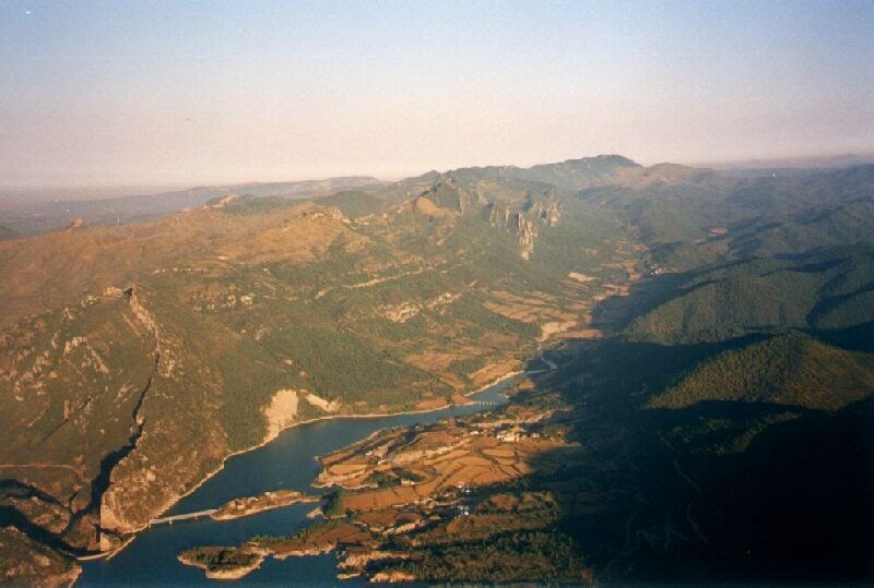 Mi vuelo por Zaragoza es corto, un poco más que la longitud Este -Oeste del embalse,que hace poco se ha quedado atrás. La provincia de Huesca me da la bienvenida con el tortuoso paisaje de los meandros del Rio Aragón enmarcados por bosquecillos verdes de pino,encina y playas grises de canto rodado que contrastan con el ocre dorado de las tierras recién cosechadas de cereal.