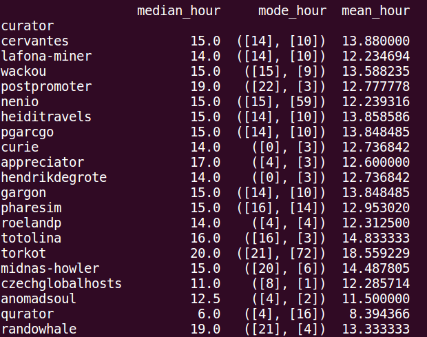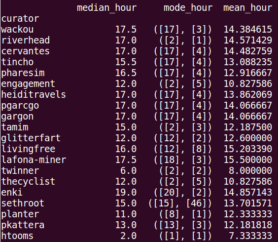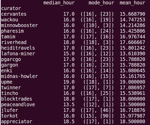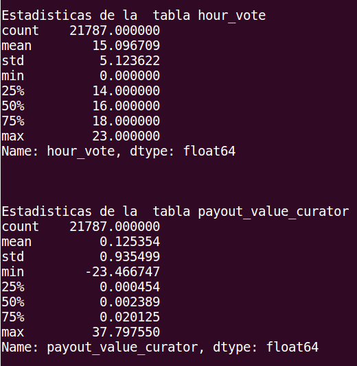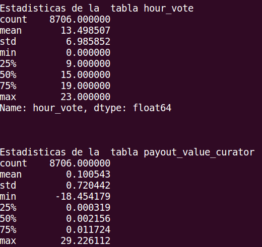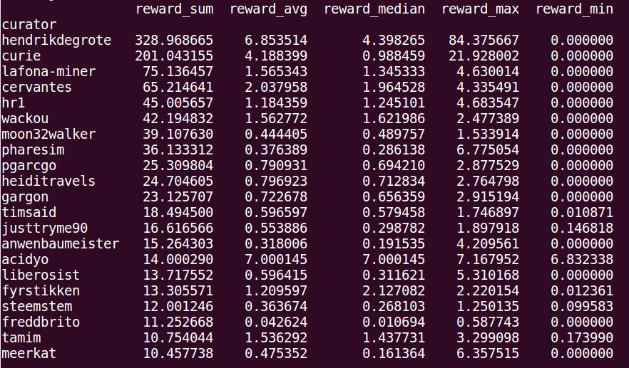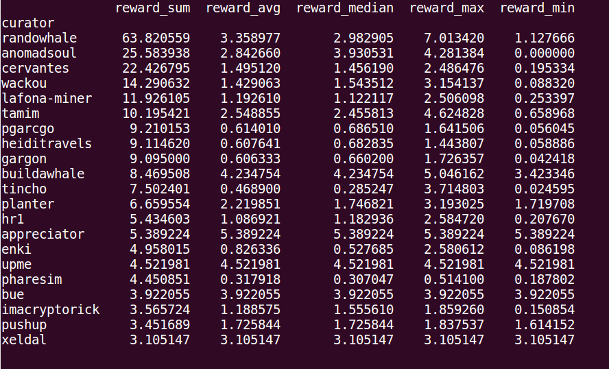 Esta tabla es muy rica en información, y más adelante creare un script que extraiga cuáles Publicaciones tienen los mejores Votos y cuáles los peores. Por ahora nos quedamos con los mejores curadores según sus sumas, el promedio según los votos con el average, y máximos y mínimos. En la entrada anterior esta un poquito más detallada la Tabla.