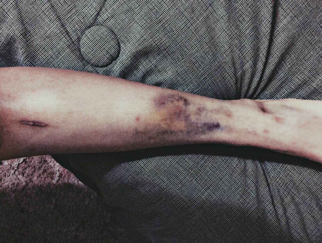 Los hematomas en mi pierna son causa de que me golpeó fuertemente con un martillo en la pierna