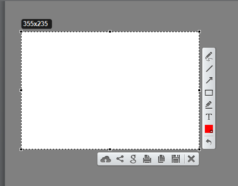 Al presionarla la pantalla se coloca de color un poco obscura y puede dibujar un recuadro con el ratón del área que quiera capturar luego que dibuje su recuadro le saldrán dos barras una es la de herramientas para usar en el cuadro y la otra es las opciones de guardado y compartir