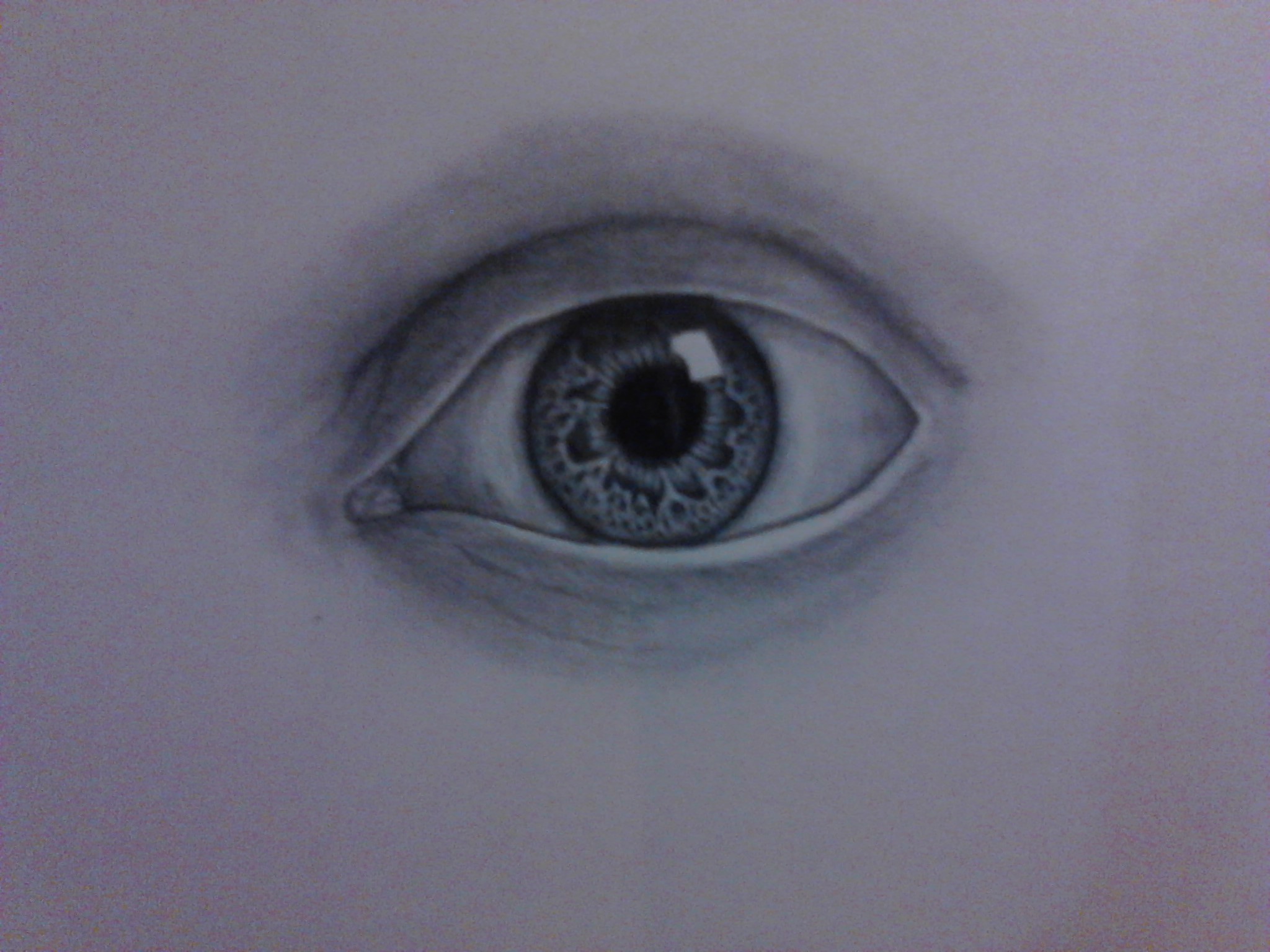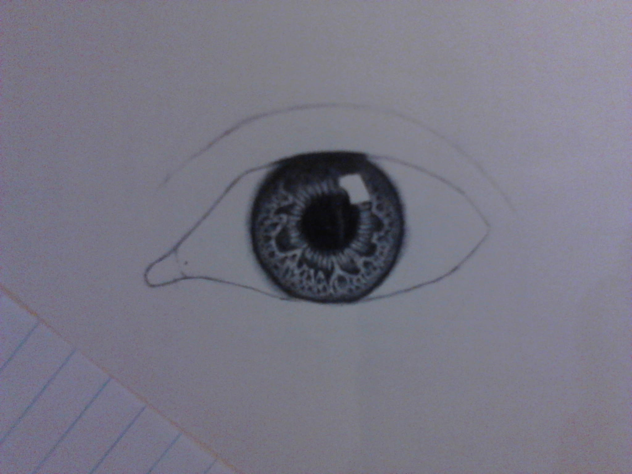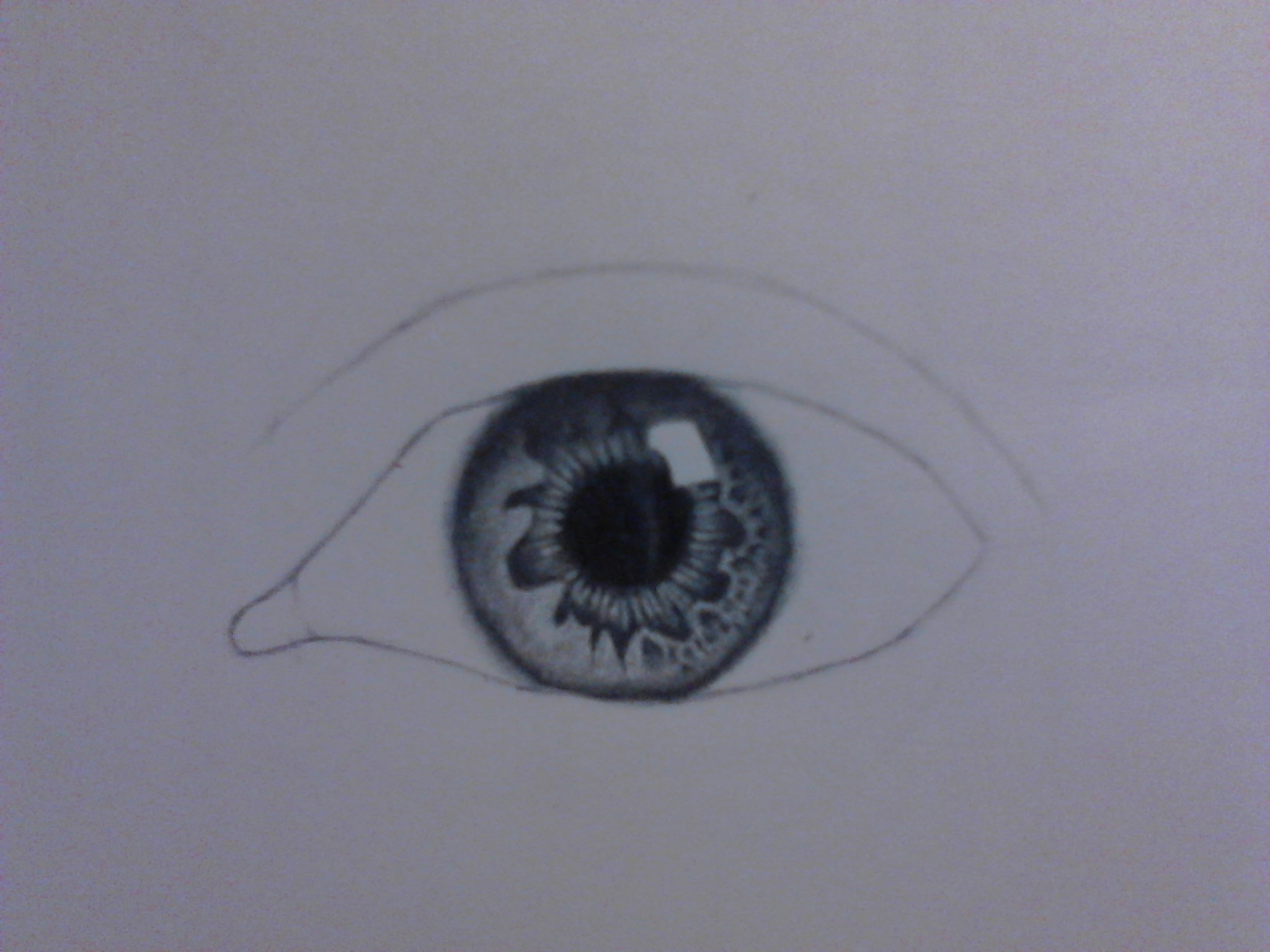 como pueden ver en la imagen aun se ve como feo pero no se preocupen el siguiente paso le comenzara a dar vida, con el mismo lapiz HB comienza a oscurecer las zonas el iris los bordes y dejando igual la base aun no difuminan mucha gente difumina lo que es el ojo y en realidad le quita realismo esta tecnica que te enseño la aprendi de tantos errores y me di cuenta que sin difuminar en esta parte se dan un buen resultado, para dar mas fuerzas a la zonas oscuras usa el 2B pero no te pases de tono solo un poco mas oscura y ya