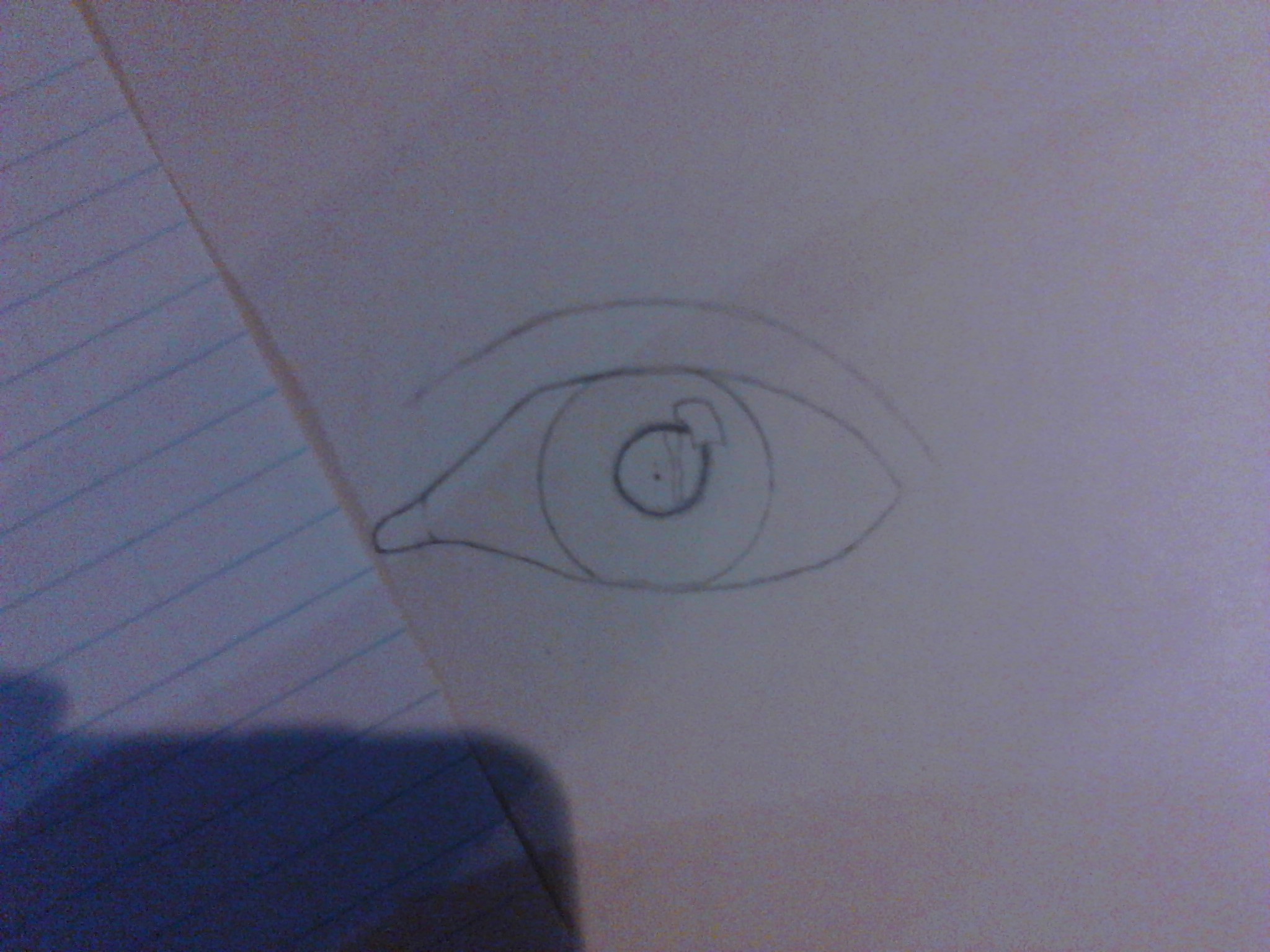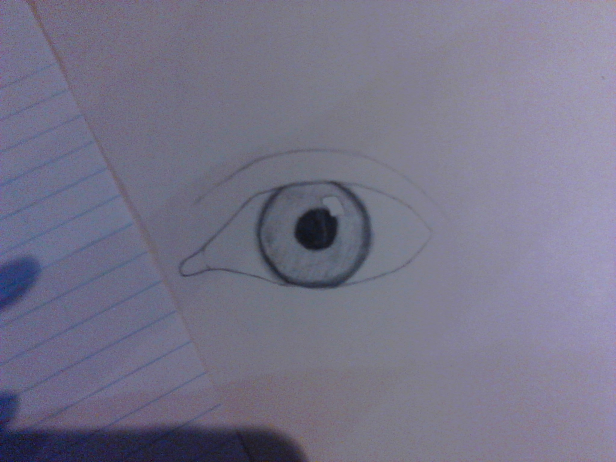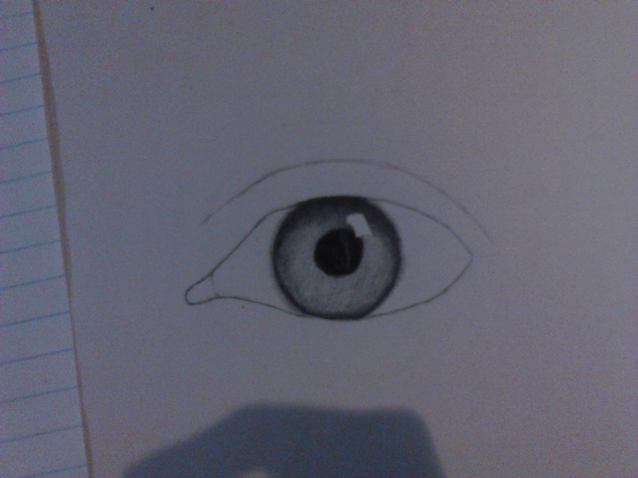 como pueden ver en la imagen aun se ve como feo pero no se preocupen el siguiente paso le comenzara a dar vida, con el mismo lapiz HB comienza a oscurecer las zonas el iris los bordes y dejando igual la base aun no difuminan mucha gente difumina lo que es el ojo y en realidad le quita realismo esta tecnica que te enseño la aprendi de tantos errores y me di cuenta que sin difuminar en esta parte se dan un buen resultado, para dar mas fuerzas a la zonas oscuras usa el 2B pero no te pases de tono solo un poco mas oscura y ya