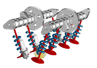 En esta animación se puede apreciar el funcionamiento de un sistema de distribución con Resortes, donde ellos permiten que las válvulas vuelven a su punto original. Pero como ya he comentado anteriormente este sistema resulta ineficientes en altos regímenes de revoluciones ya que hay un punto de flote donde la válvula corre el riesgo de chocar con el pistón.