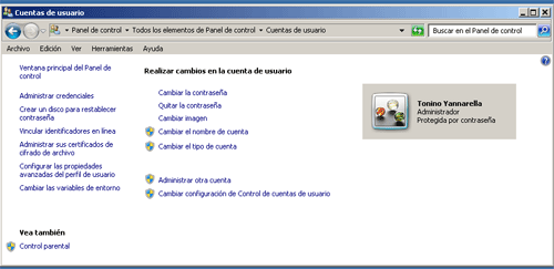 Vamos a ver cómo crear una cuenta para los niños y/o para cada usuario de la familia, los pasos siguientes se realizan desde un Equipo con Windows 7, pero es muy similar en Windows 8 y Windows 10. Lo primero que haremos es colocar una contraseña a nuestra cuenta si no la tiene y por supuesto no indicarla a nadie, vamos a ubicar la opción “Cuentas de Usuario” en el panel de control: