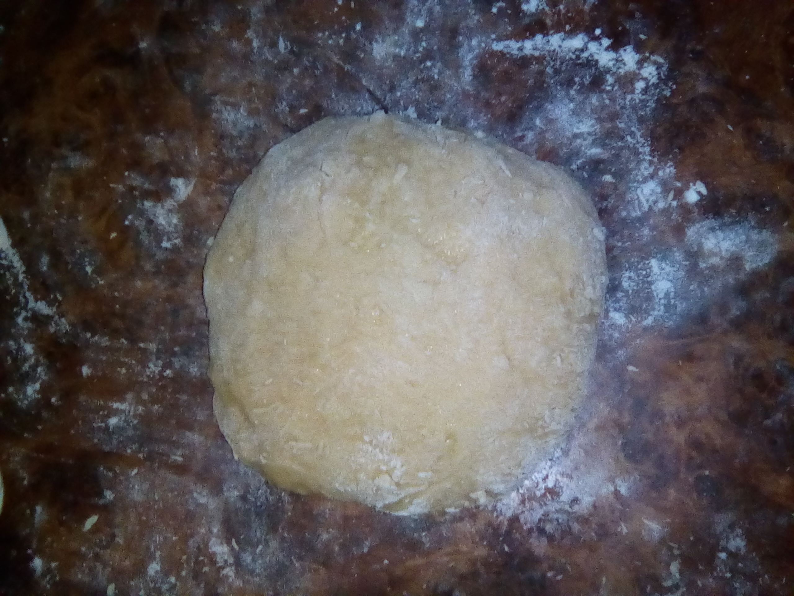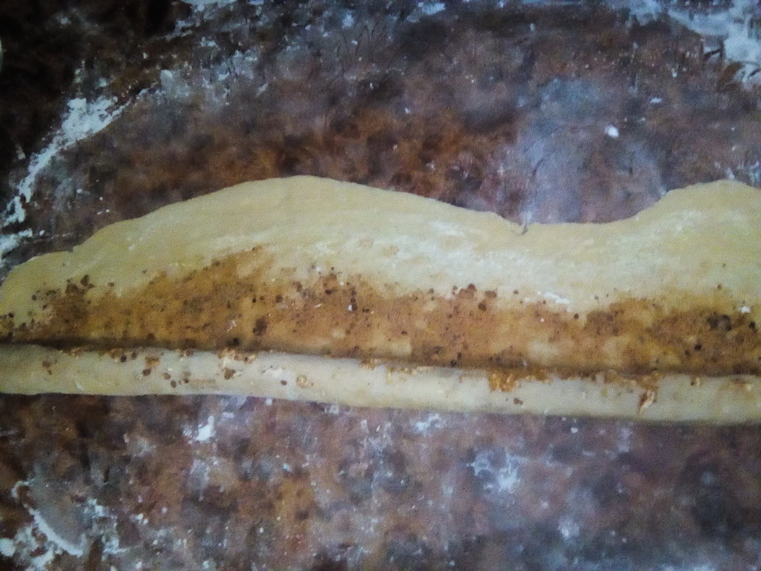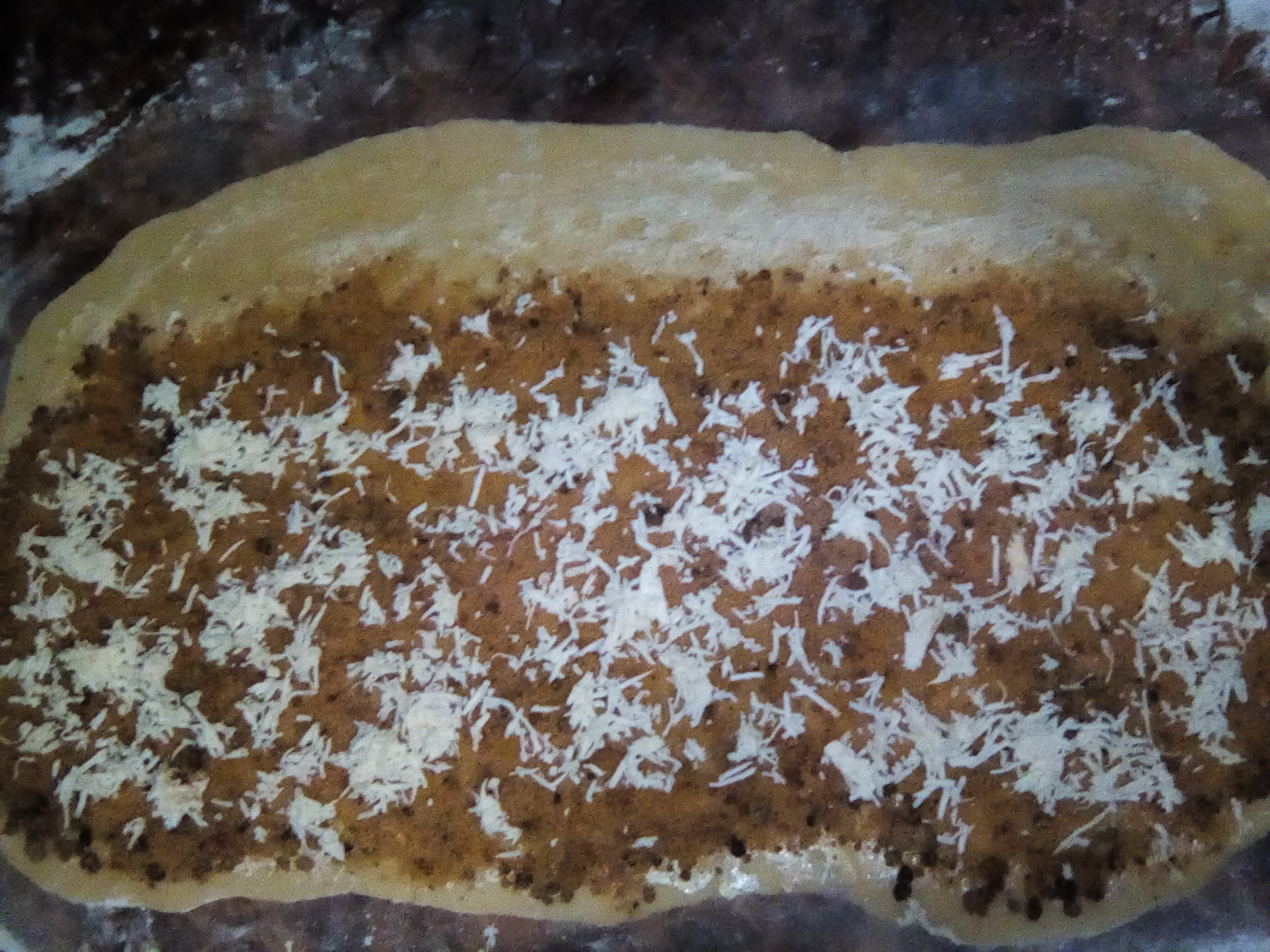 Pasada la hora, sacas del bol, enharinas tu mesa de trabajo y extiendes en forma rectangular con rodillo, ya estirada la barnizas con mantequilla, espolvoreas con papelón y por ultimo el queso.