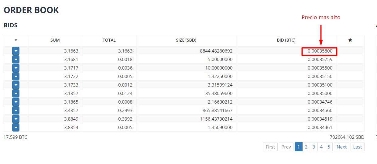 Nos encontraremos con una pantalla similar a esta a la izquierda en bid tenemos los precios de compra de sbd y a la derecha los precios de venta, nos dirigimos a la sección de Sell SteemDollars
