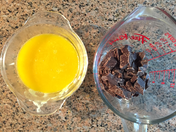 Derretimos la mantequilla en el microondas y cortamos el chocolate en trozos pequeños y lo colocamos en un tazon para revolver.