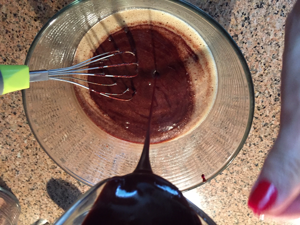 Después de haber batido muy bien, añadimos la mezcla de chocolate que preparamos previamente y mezclamos.