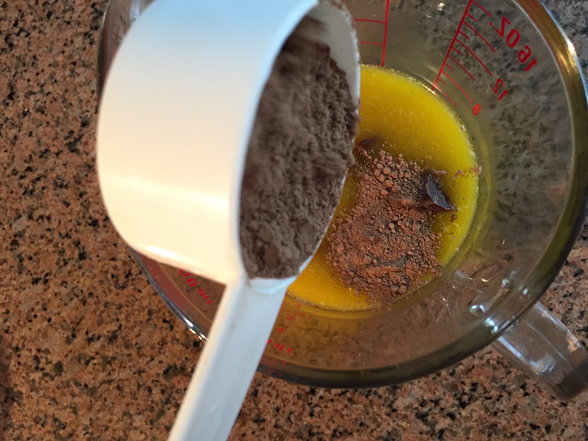 Colocamos la mantequilla derretida y caliente en el tazón con los chocolates, añadimos 1/4 de taza de cacao, mezclamos bien hasta que se integren los 3 ingredientes y se forme una especie de ganage de chocolate.