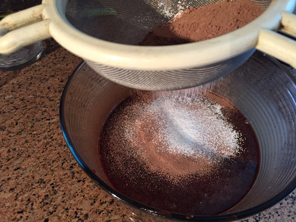 Ahora añadimos la harina y el cacao restante, tamizado para que no se formen grumos y mezclamos con movimientos envovlentes.