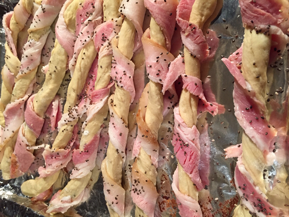 Enrollamos las tiras de masa junto con la tocineta.