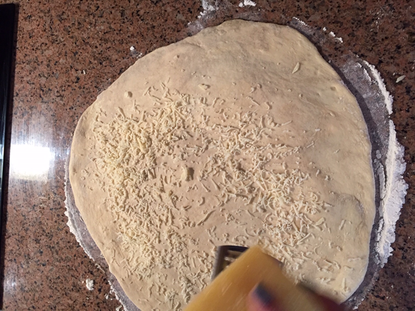 Estiramos la masa en una mesa, y colocamos el queso rallado.