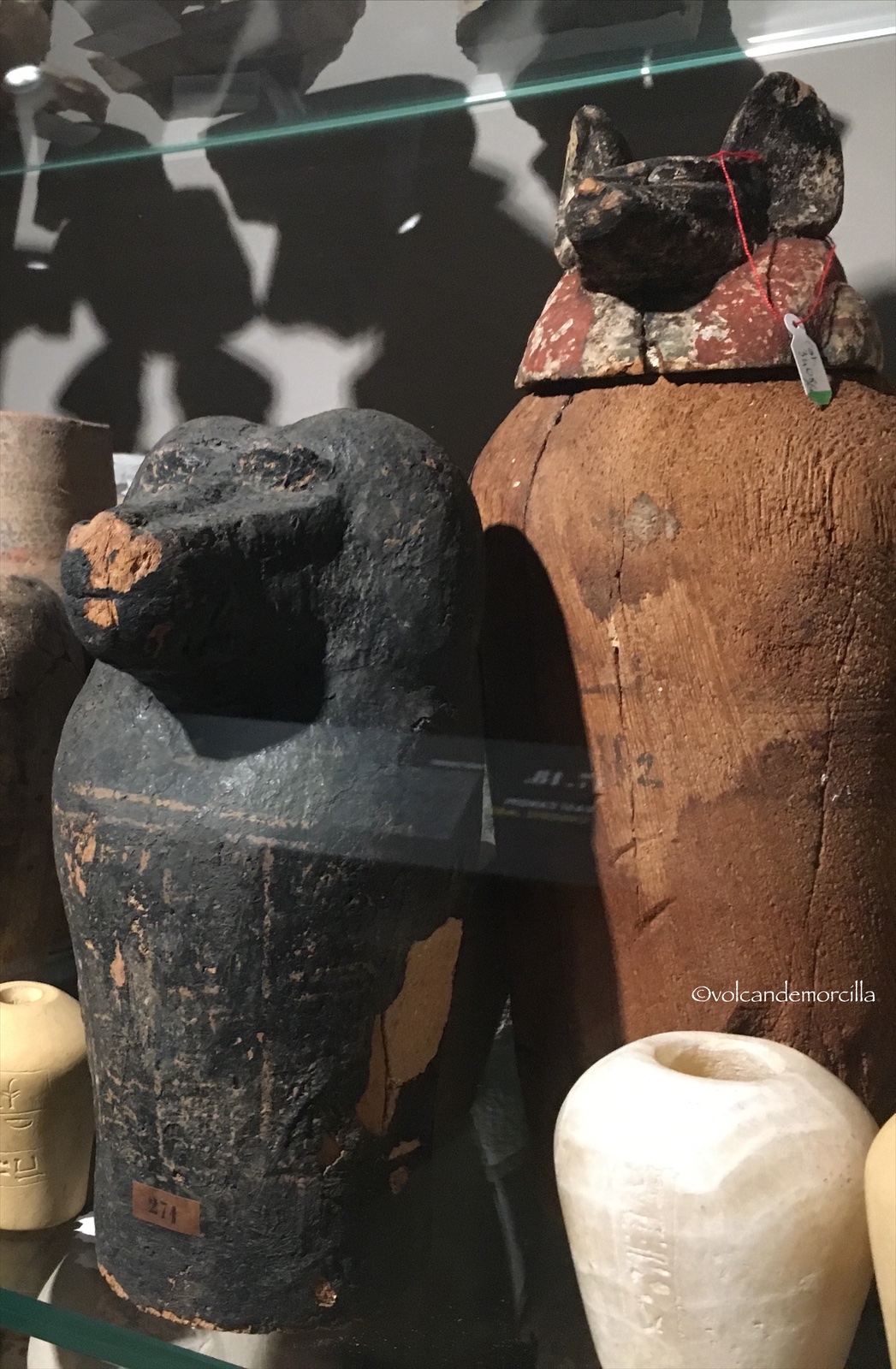 The canopic vessels were vessels with a lid. The shape of the cover varied according to the divinity they represented. At the Egyptian Museum in Turin, last year I had the opportunity to take some photographs of several canopic vessels that were in a showcase.