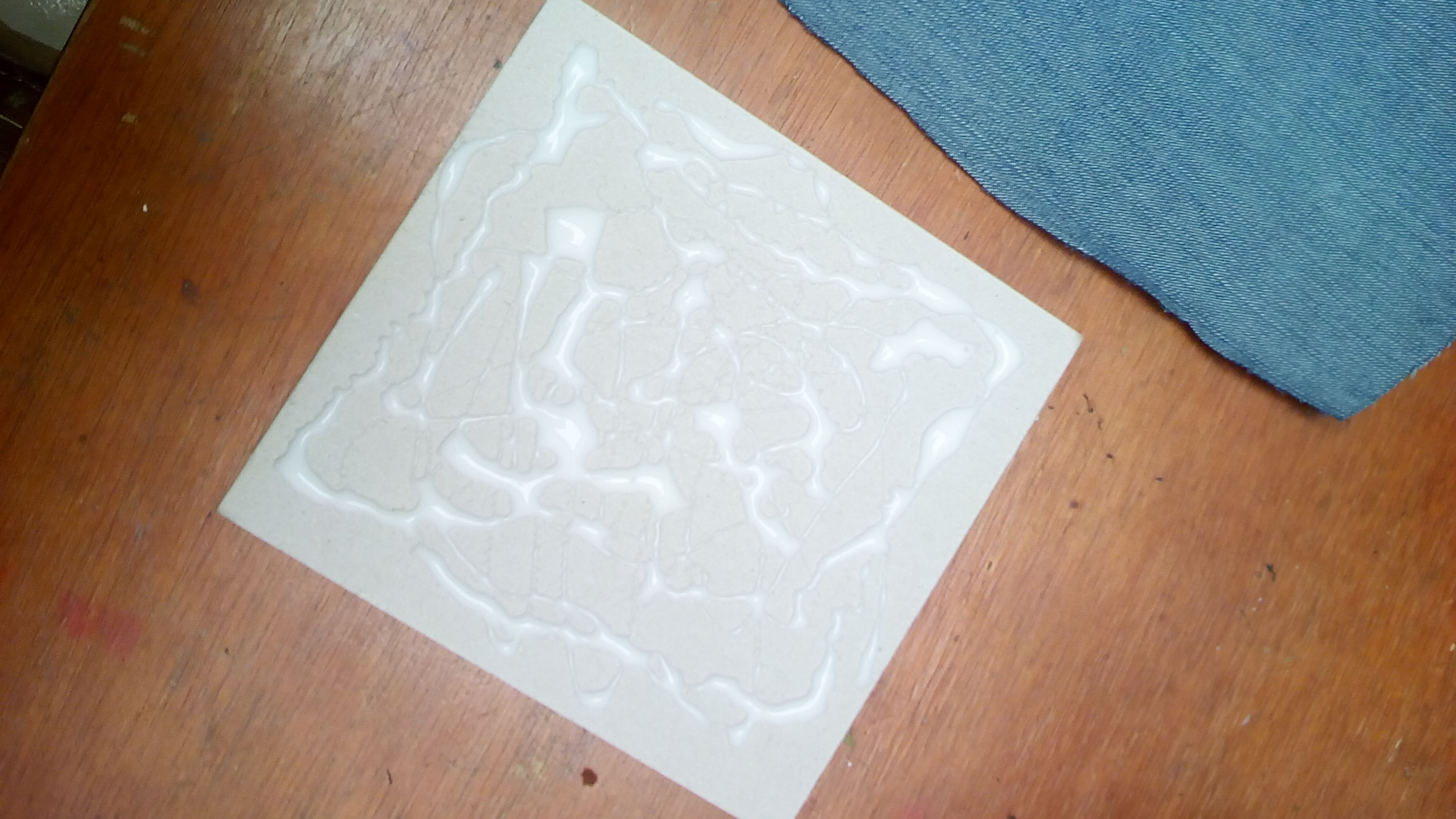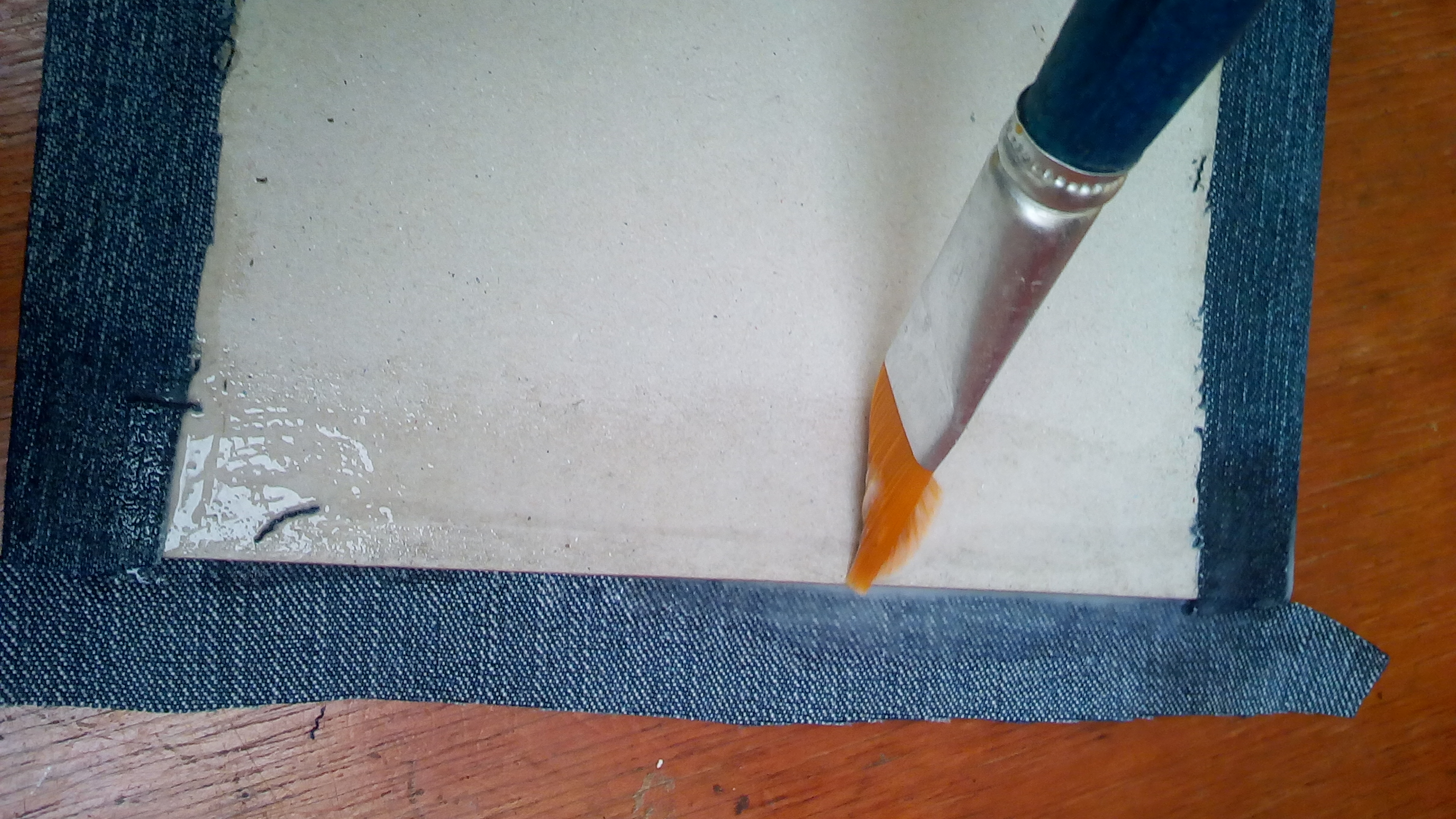 Lo dejas secar y cuando esté bien seco, le aplicas 2 capas de pintura blanca por el lado que está cubierto por el Jean