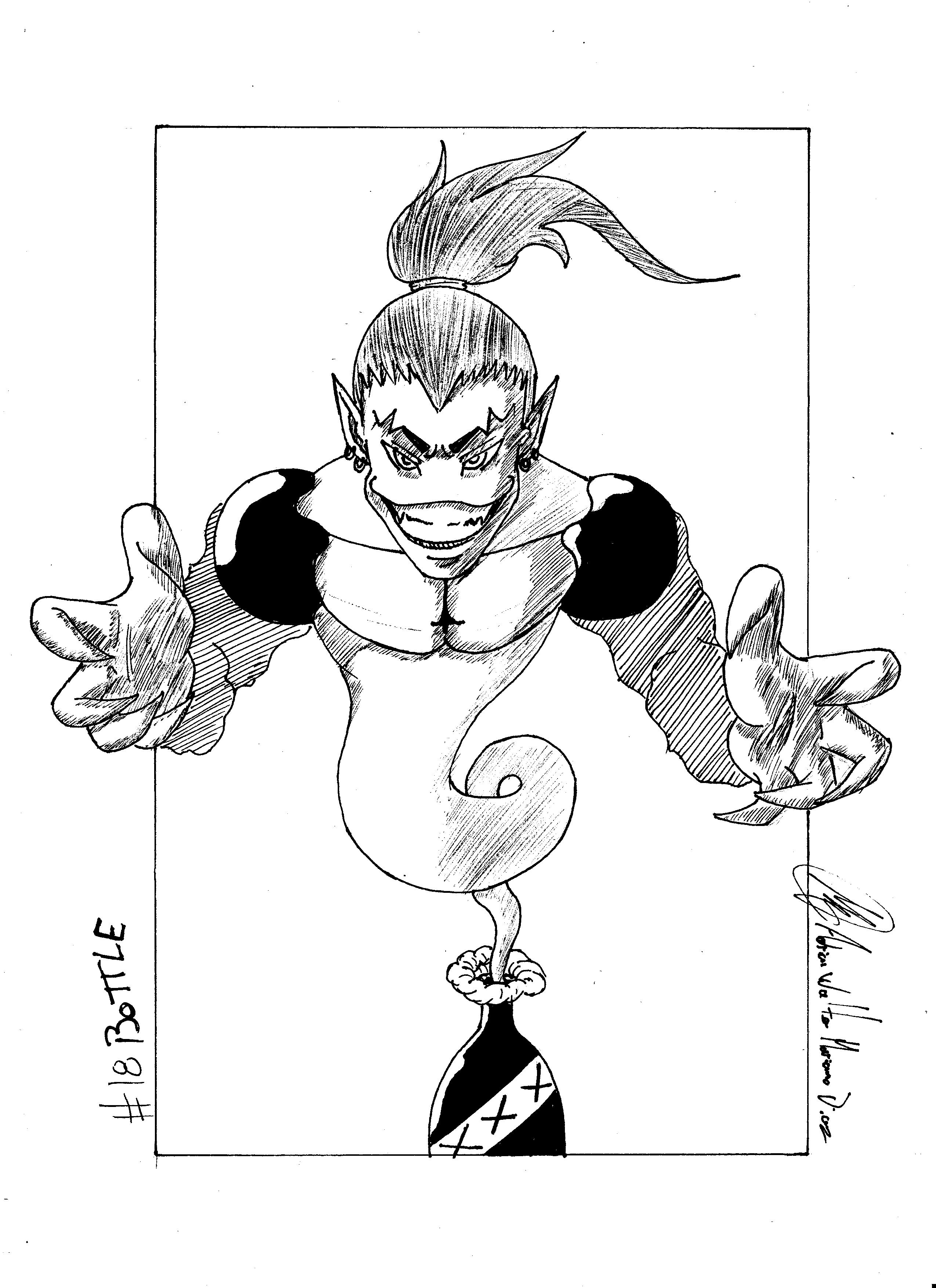 Día 18 bottle(botella) ya para esta altura del mes me estaba quedando sin ideas. Este dibujo termino siendo un genio, pero en lugar de salir de una lampara sale de una botella jajaj