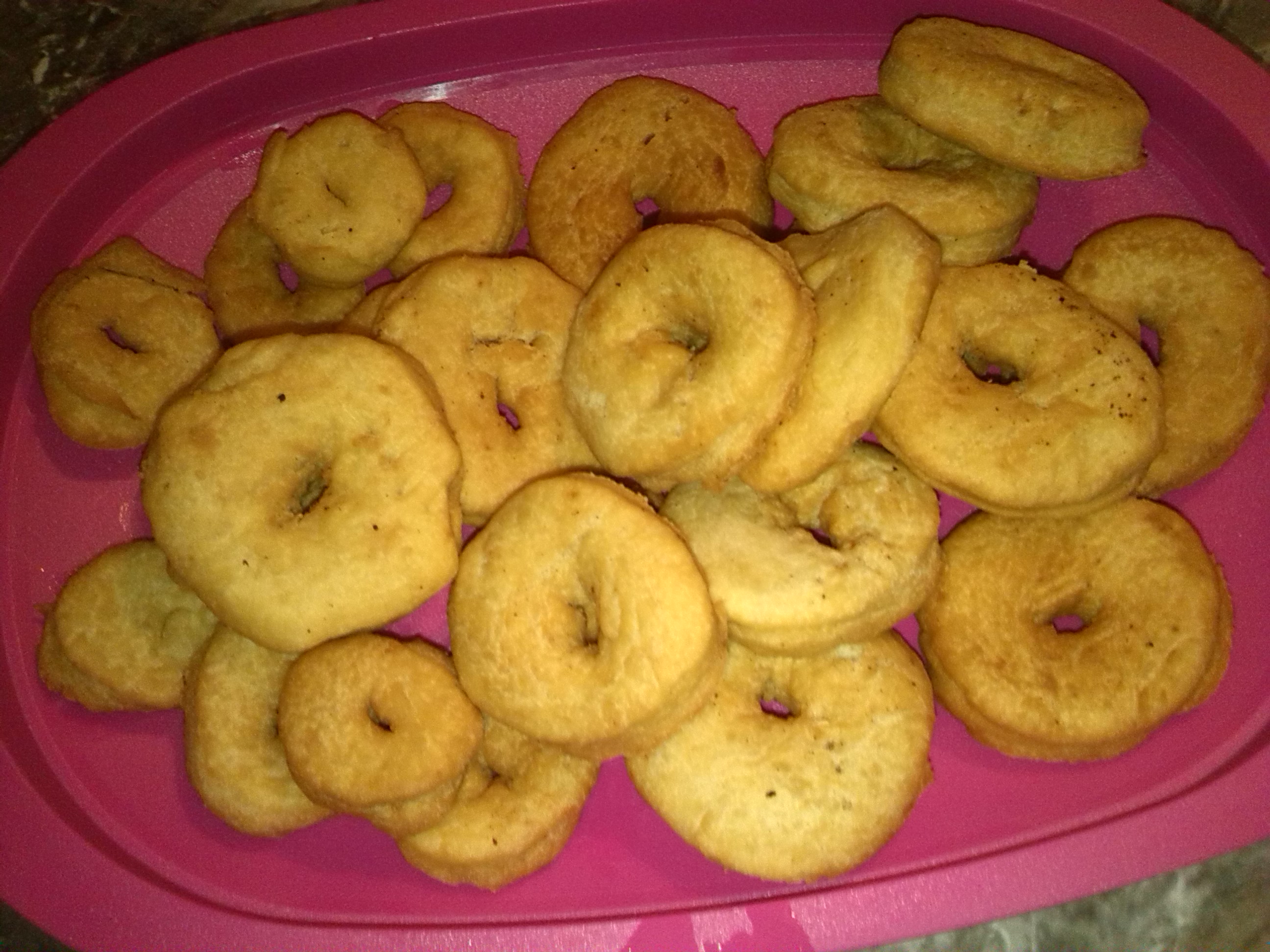 Luego las vas despegando una por una y con tu dedo abres un hueco pequeño en el medio y al tener una cierta cantidad de donas moldeadas puedes freir en un sarten con aceite y a fuego medio por que se queman con facilidad, al estar doradas las sacas y las dejas enfriar para luego glasear con el dulce que prefieras , pero quedan tan ricas que hay quien las prefiere asi solas.