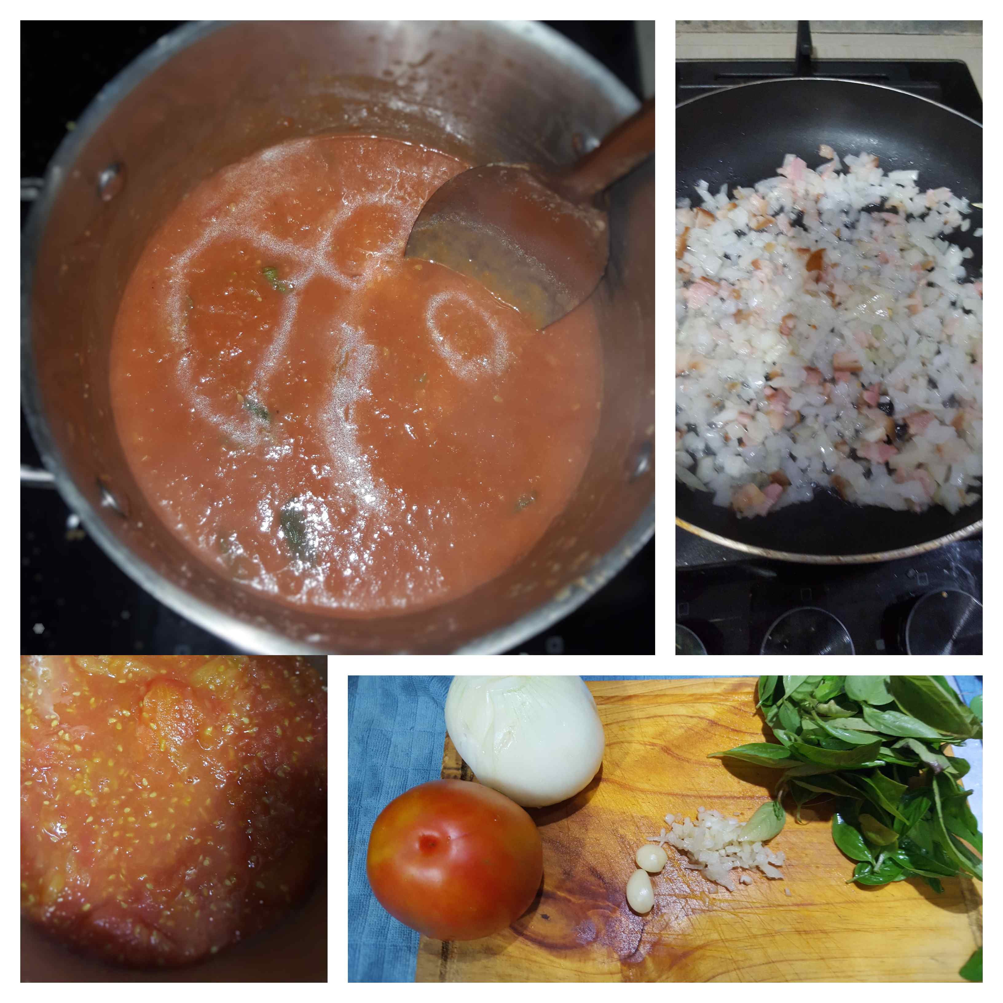 Posteriormente en un sartén grande u olla coloca un poco de aceite e incorpora la cebolla picada en cubos y los dientes de ajo cortados finamente, remueve esta mezcla hasta que observes que la cebolla comienza a dorarse. Luego coloca los tomates sin la concha y tritúralos poco a poco, agrega la cuchara de pasta de tomate, la sal, la pimienta, el orégano y la azúcar.