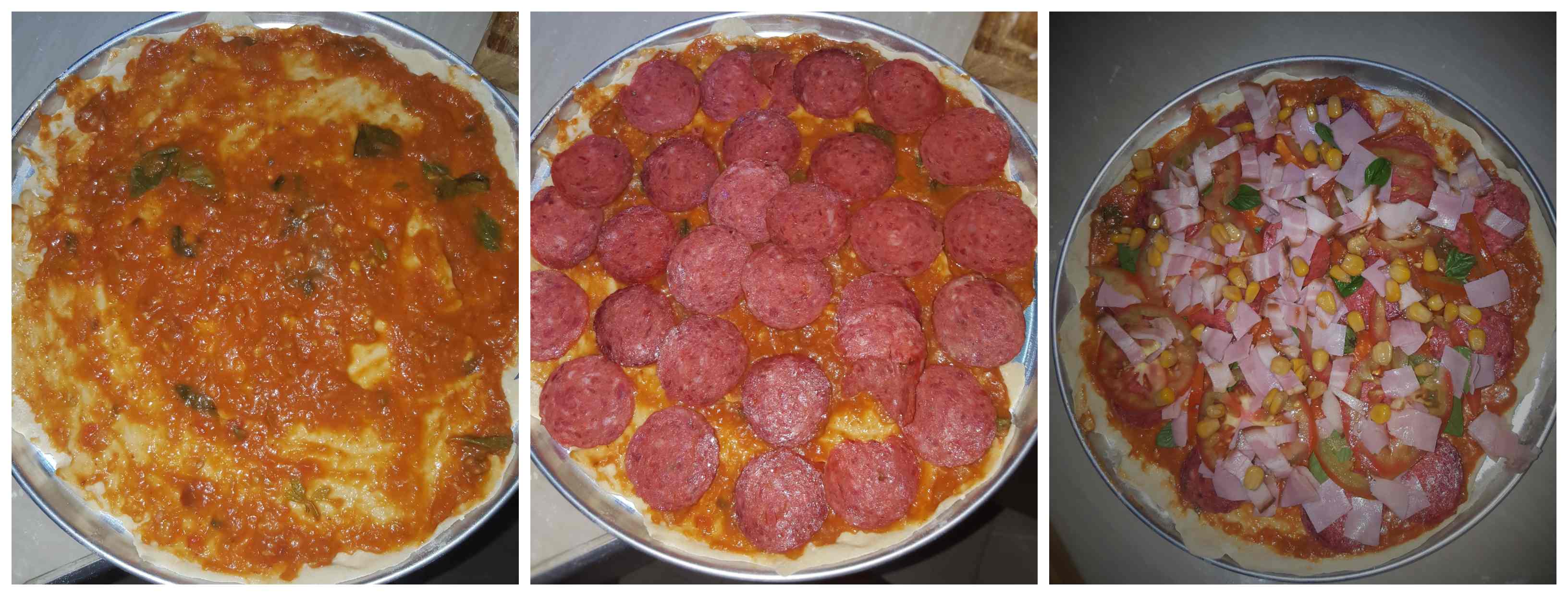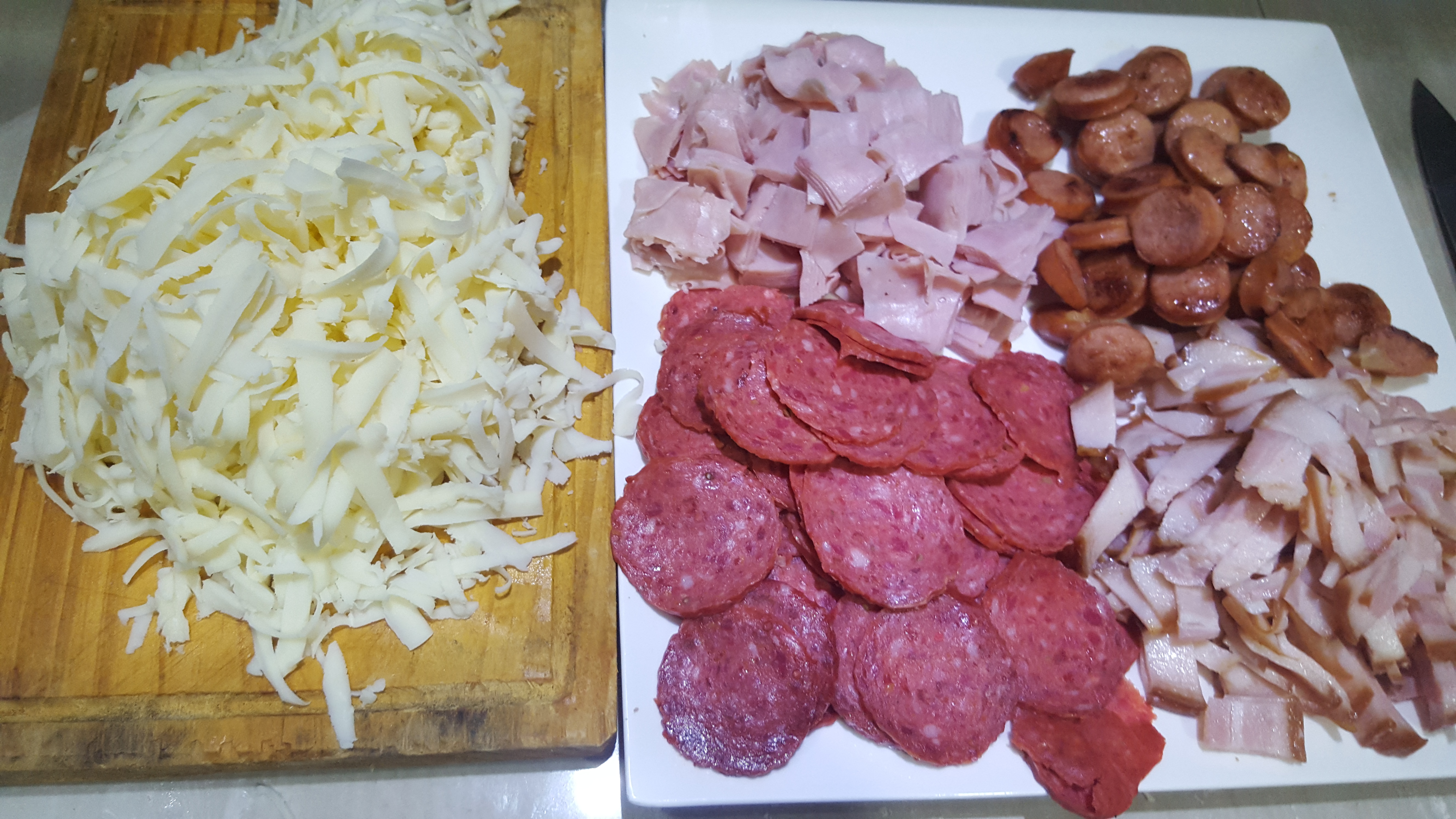 Luego de tener lista la Masa y La Salsa, se procede a cortar al gusto los ingredientes que desees agregarles a la pizza; en mi caso agregue Queso Mozarella, Jamón, Tocineta, Maíz, Pepperoni, y salchicahas, y aderece con unas ramitas de orégano fresco. Este relleno puede variar según el gusto del consumidor lo más importante es tener los ingredientes principales la Masa y la Salsa.