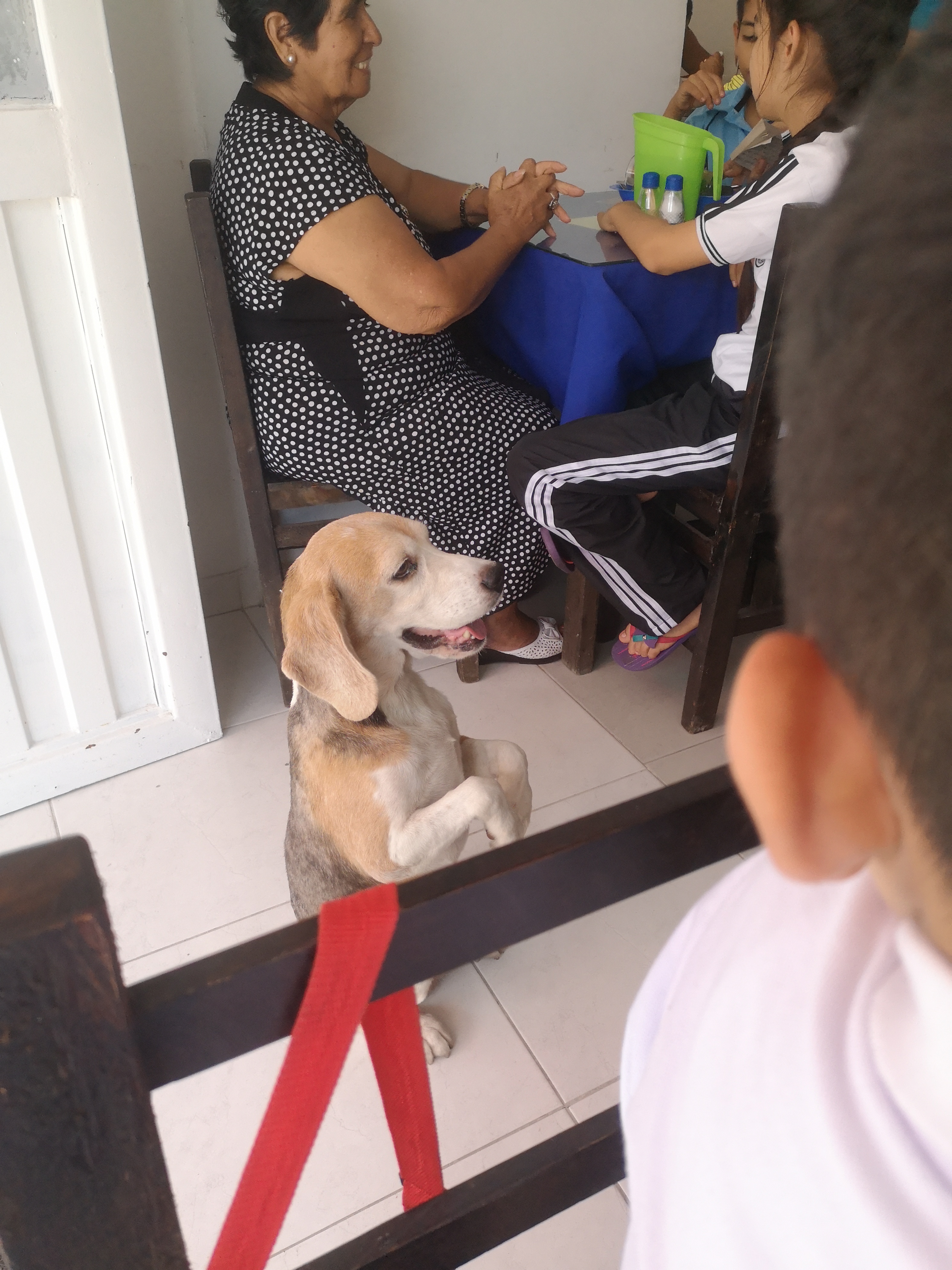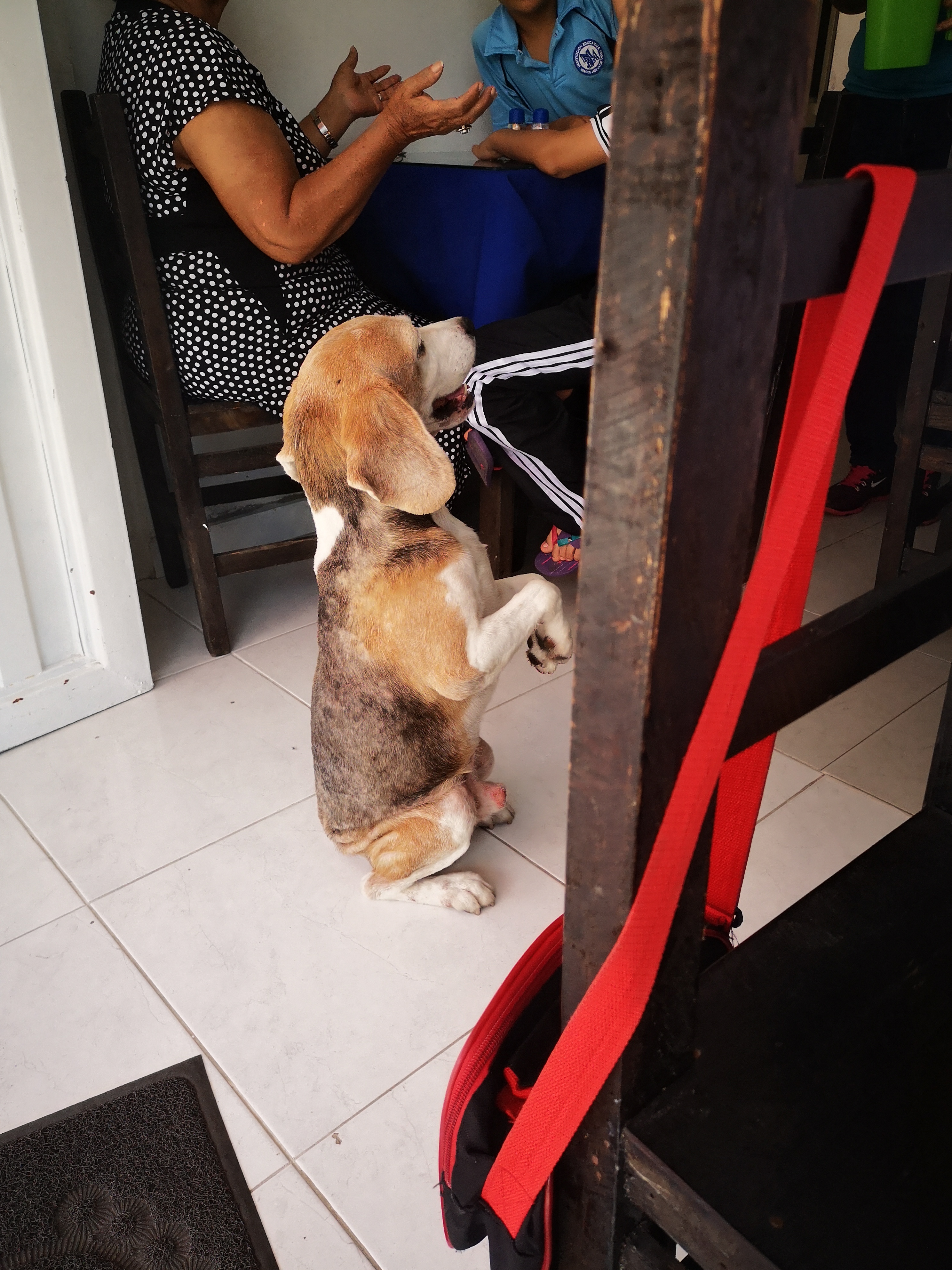 Normalmente salgo a almorzar todos los días con mi hijo al restaurante, en uno de estos días un visitante muy particular entra al restaurante, y como lo pueden observar en la imagen él sabe muy bien como pedir decentemente un bocado de comida. A juzgar por este pequeño truco, este bello perro al parecer de raza Beagle, en algún momento perteneció a una familia, pero ahora su vida es distinta y habita en las calles.