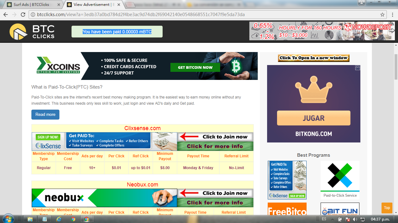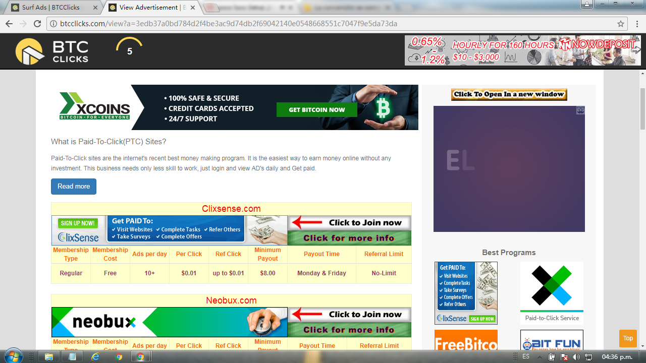 La primera página de la que hablaré es la de BTCClicks que por su nombre es probable que deduzcan de que se trata y si no pues esta página consiste en abrir anuncios y esperar a que los mismos terminen para poder recibir los BTC de recompensa.