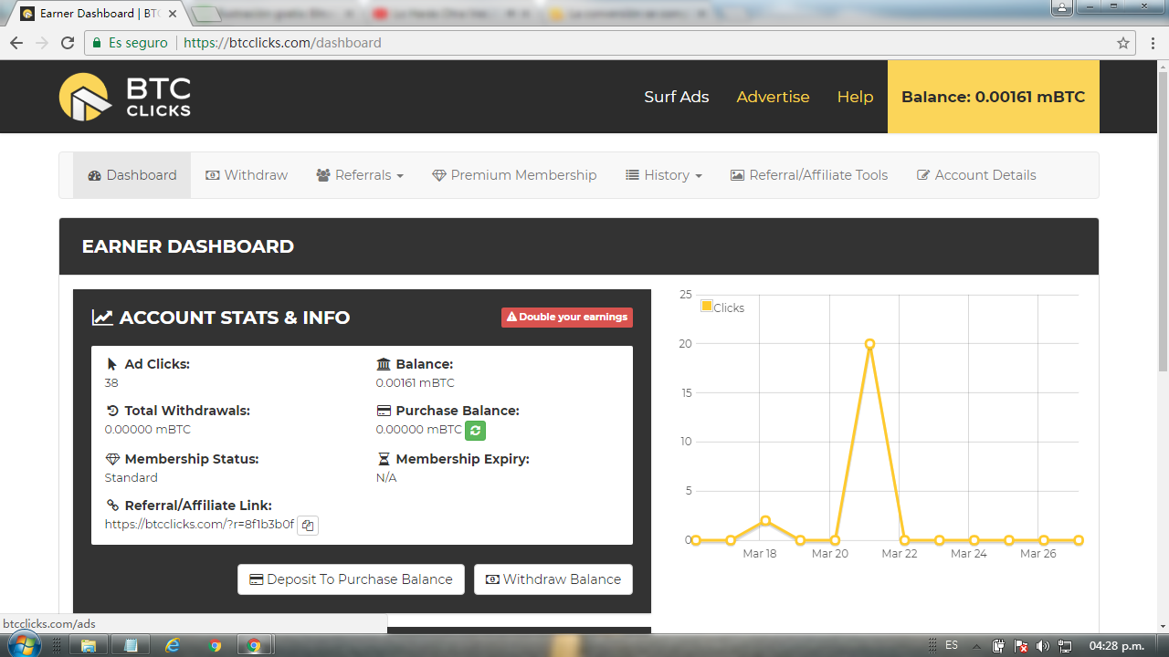 - Una vez dentro de la página se encontraran con la página principal o dashboard donde aparecerá en manera de resumen tu actividad dentro de la página, desde los clicks = anuncios seleccionados, hasta la cantidad de BTC que has retirado de la página.