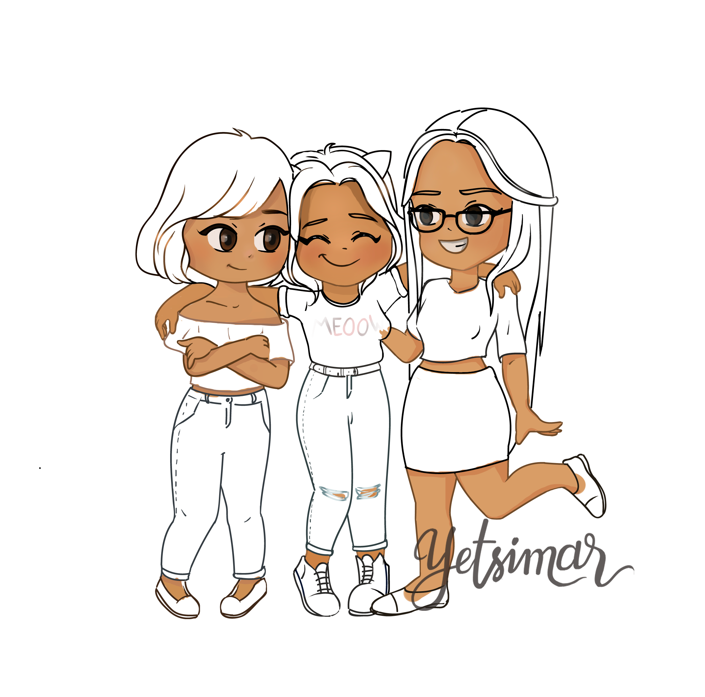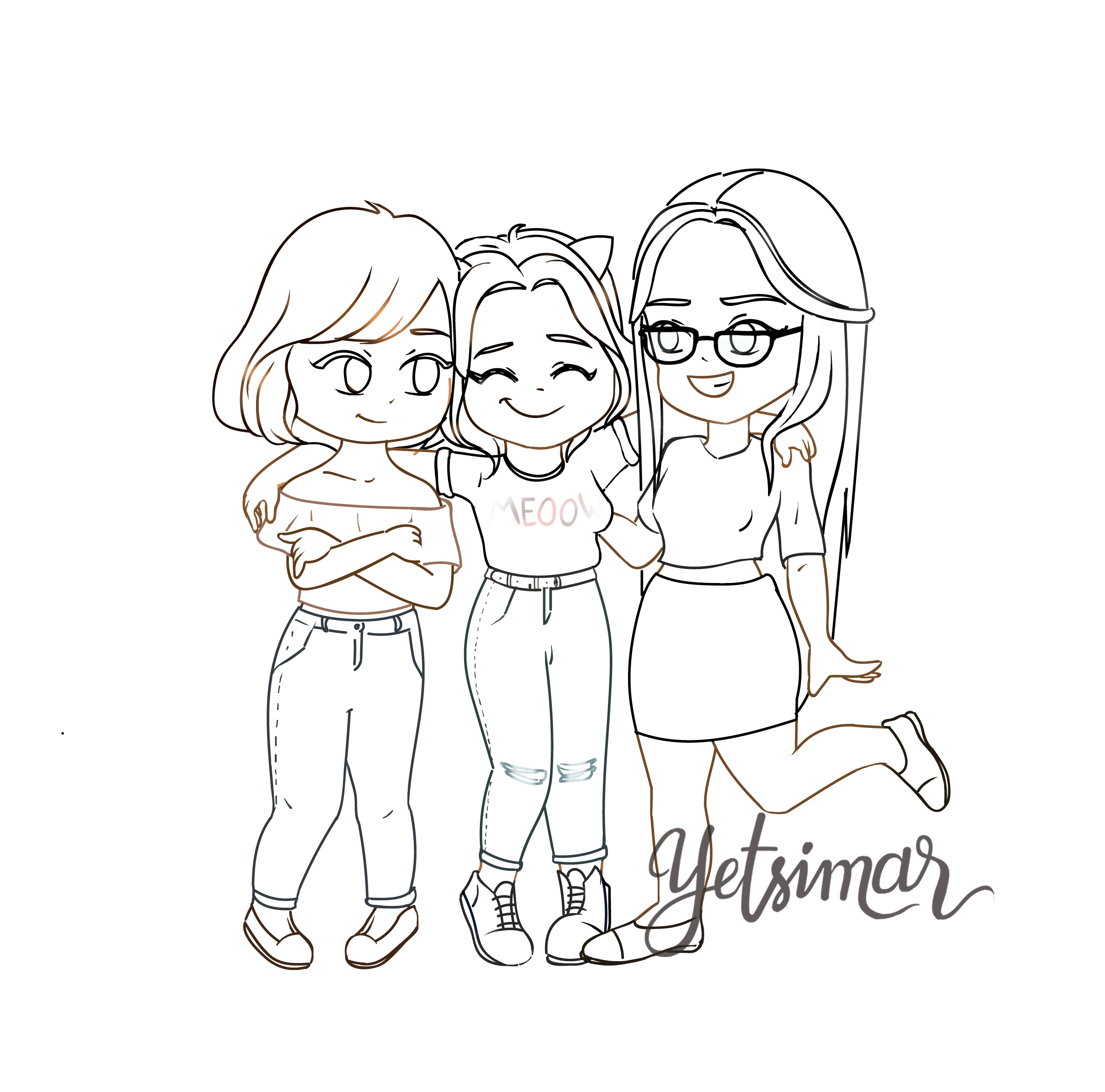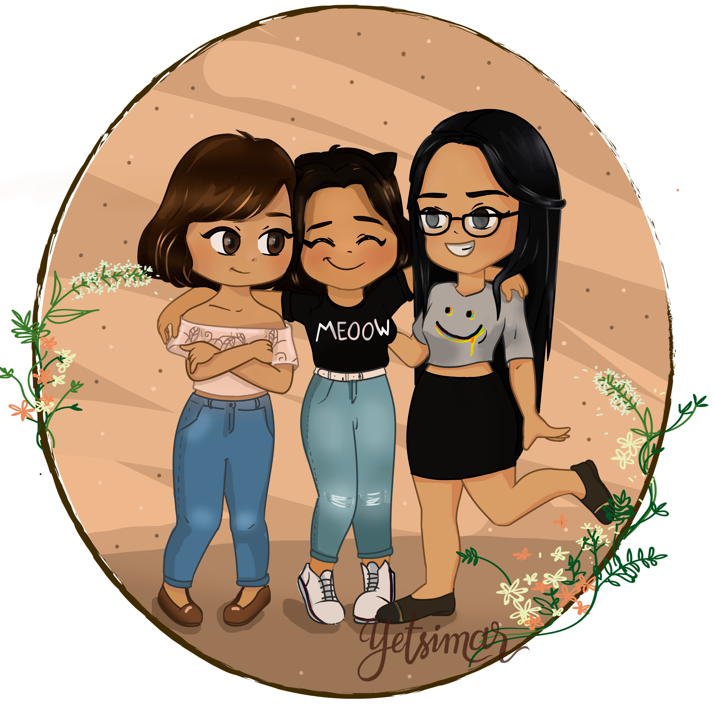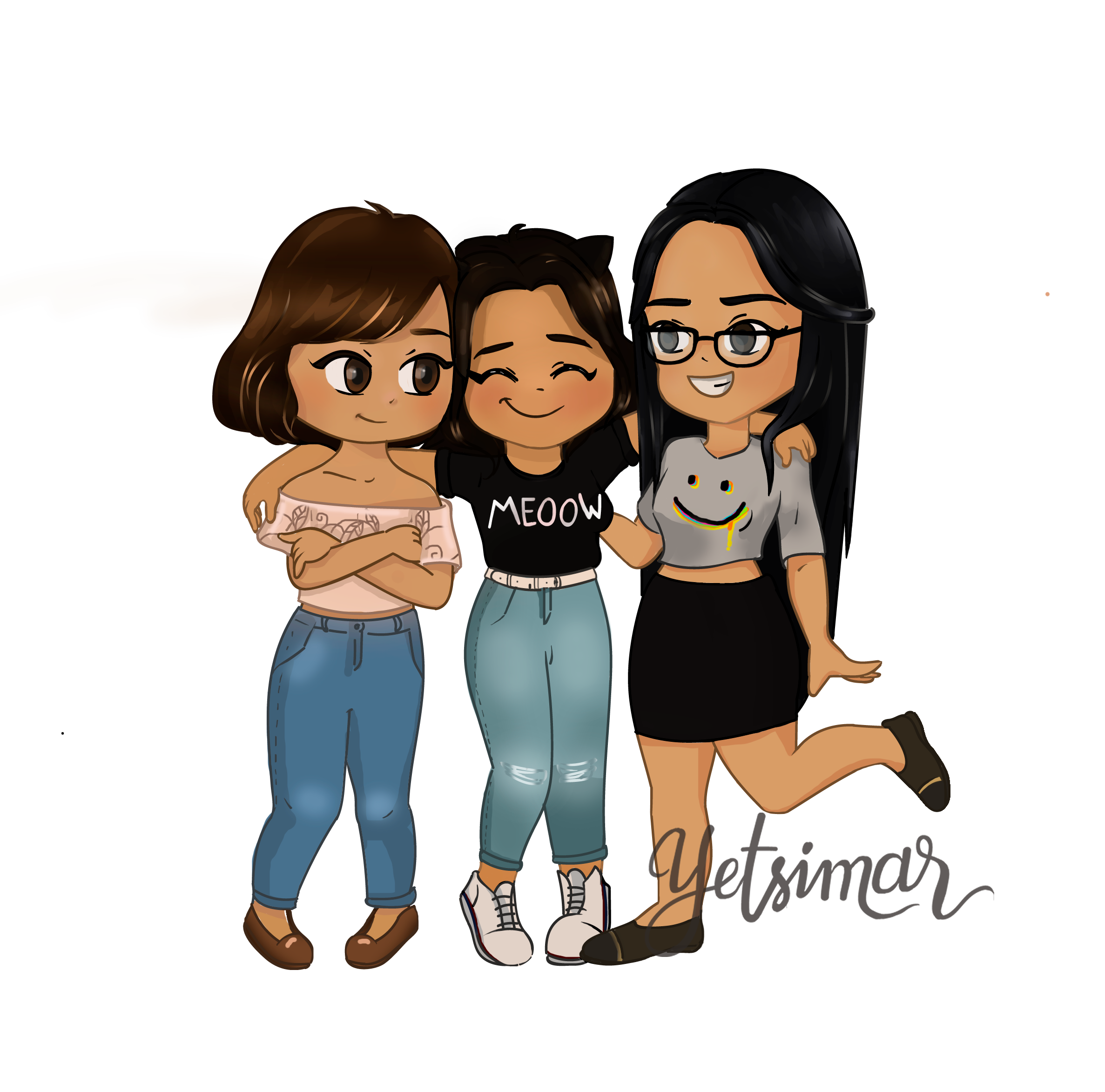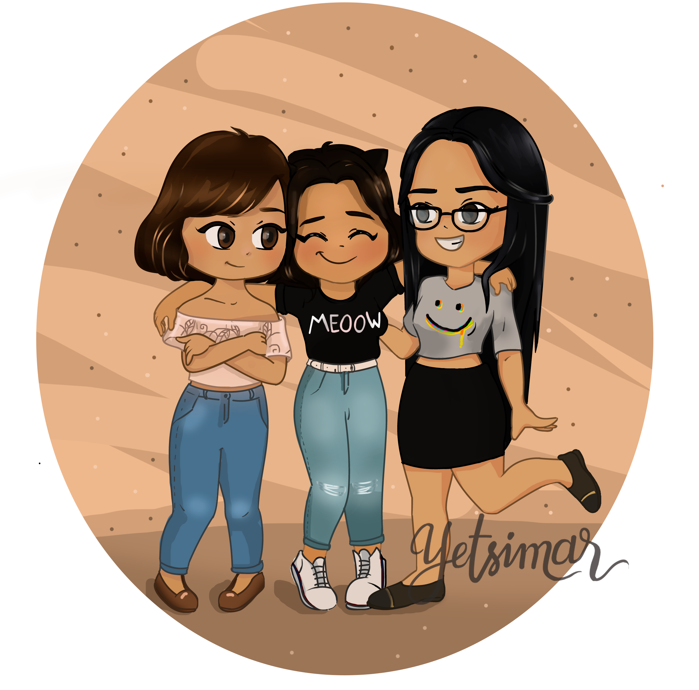 Esta ilustración en principio comenzó siendo avatares separados pero se me ocurrió unirlos con la figura central (yo) para hacer un conjunto quería captar un poco las personalidades y rasgos de mis amigas Barbara (izquierda), Hilda (a la derecha) y creo haberlo logrado