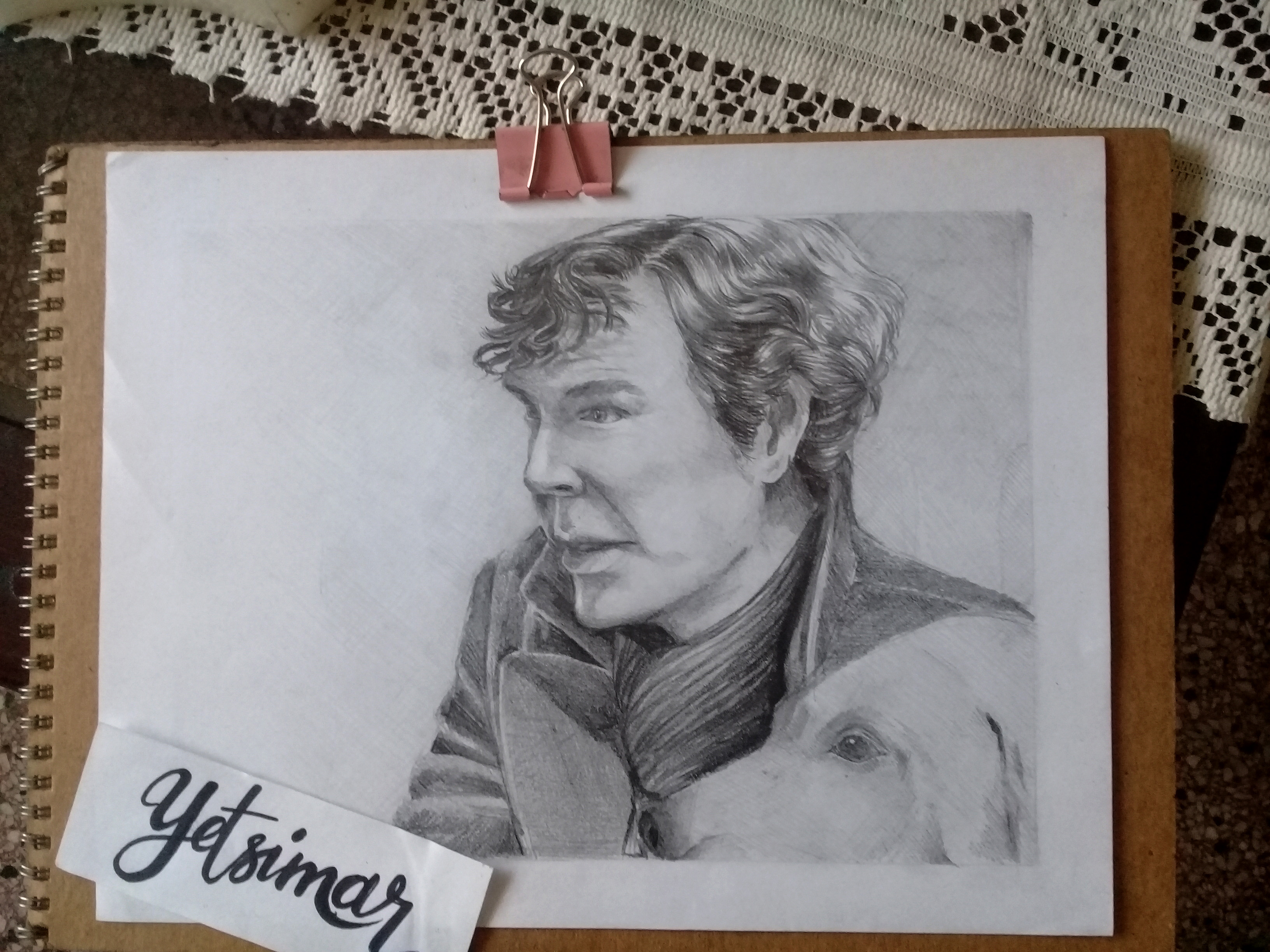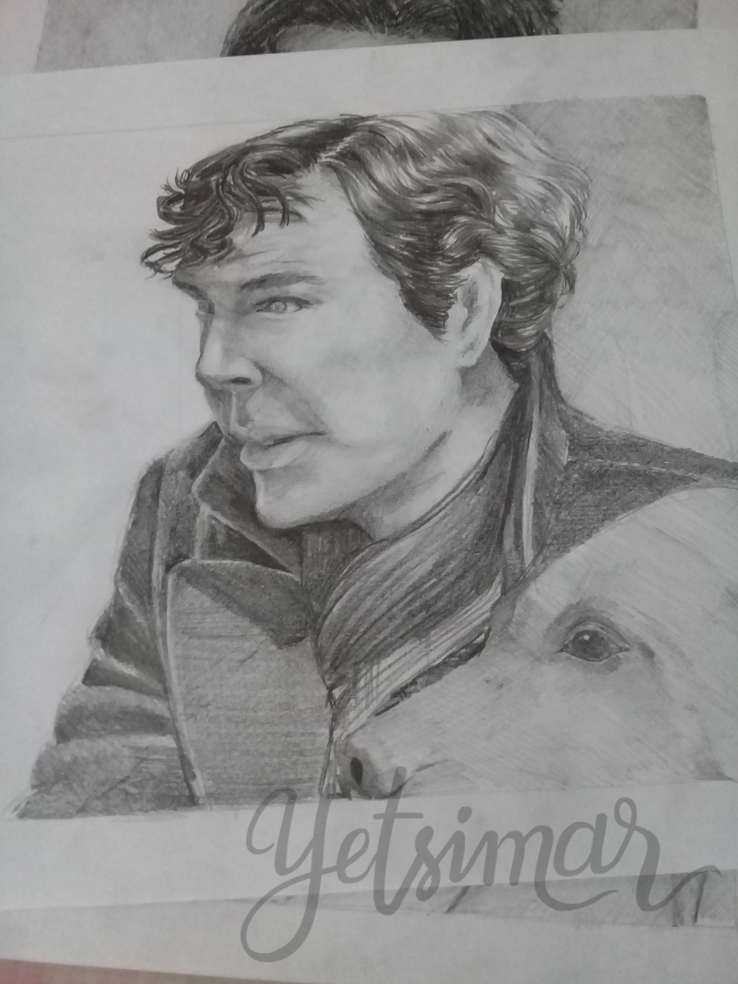 Para el post anterior describía una acción comiendo, la siguiente consistía en realizar un retrato de un ídolo con una mascota, entonces recordé que en uno de los capítulos de la serie Sherlock aparece al lado de un sabueso, es una imagen en la que ambos se encontraban mirando en la misma dirección y me pareció perfecta para el reto.