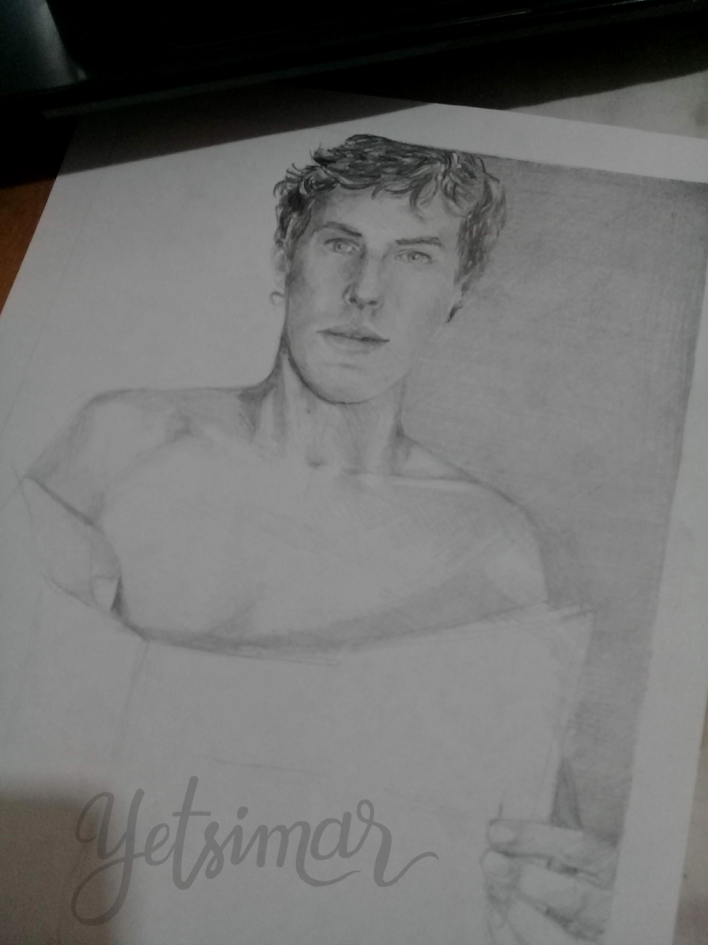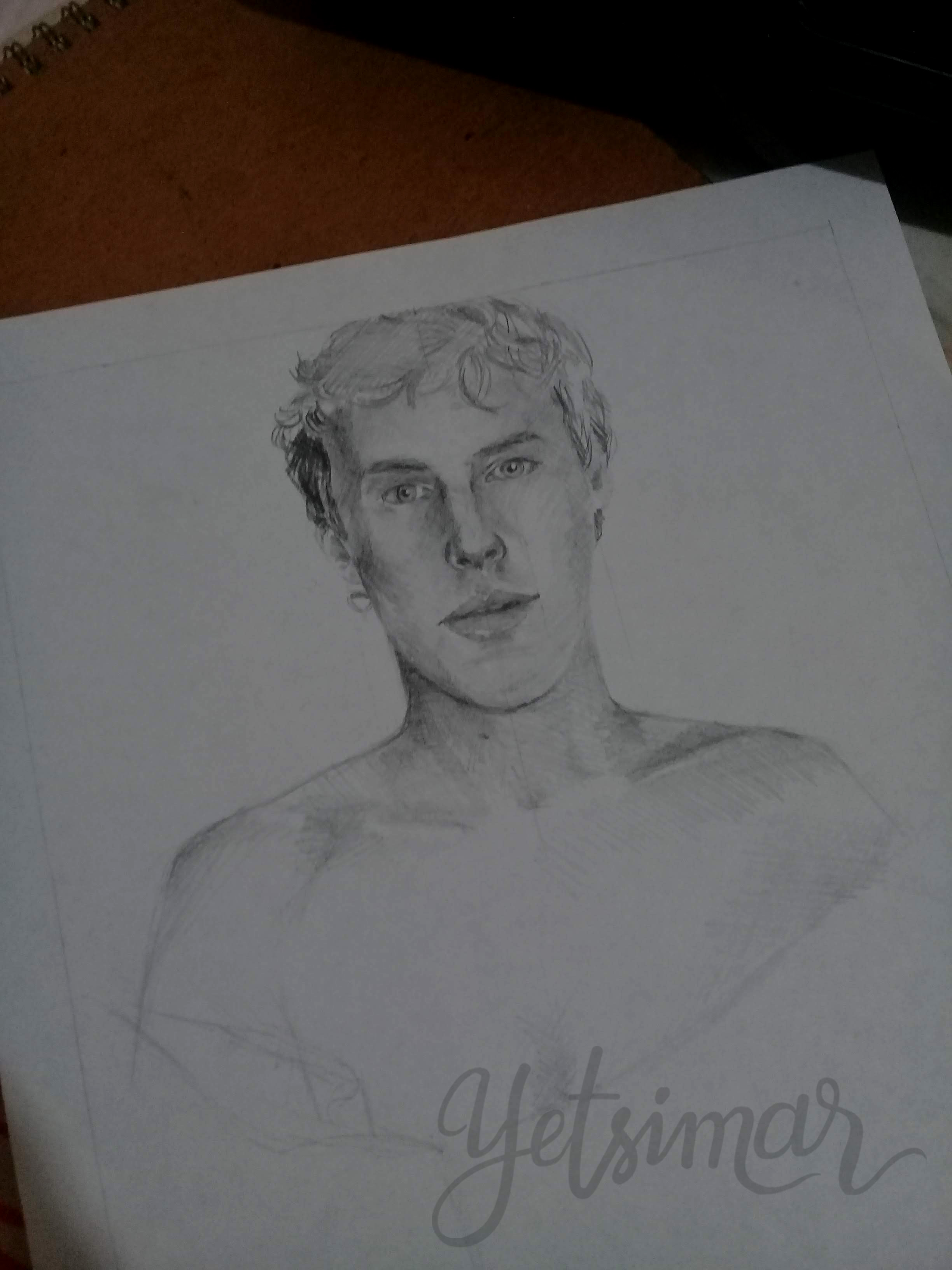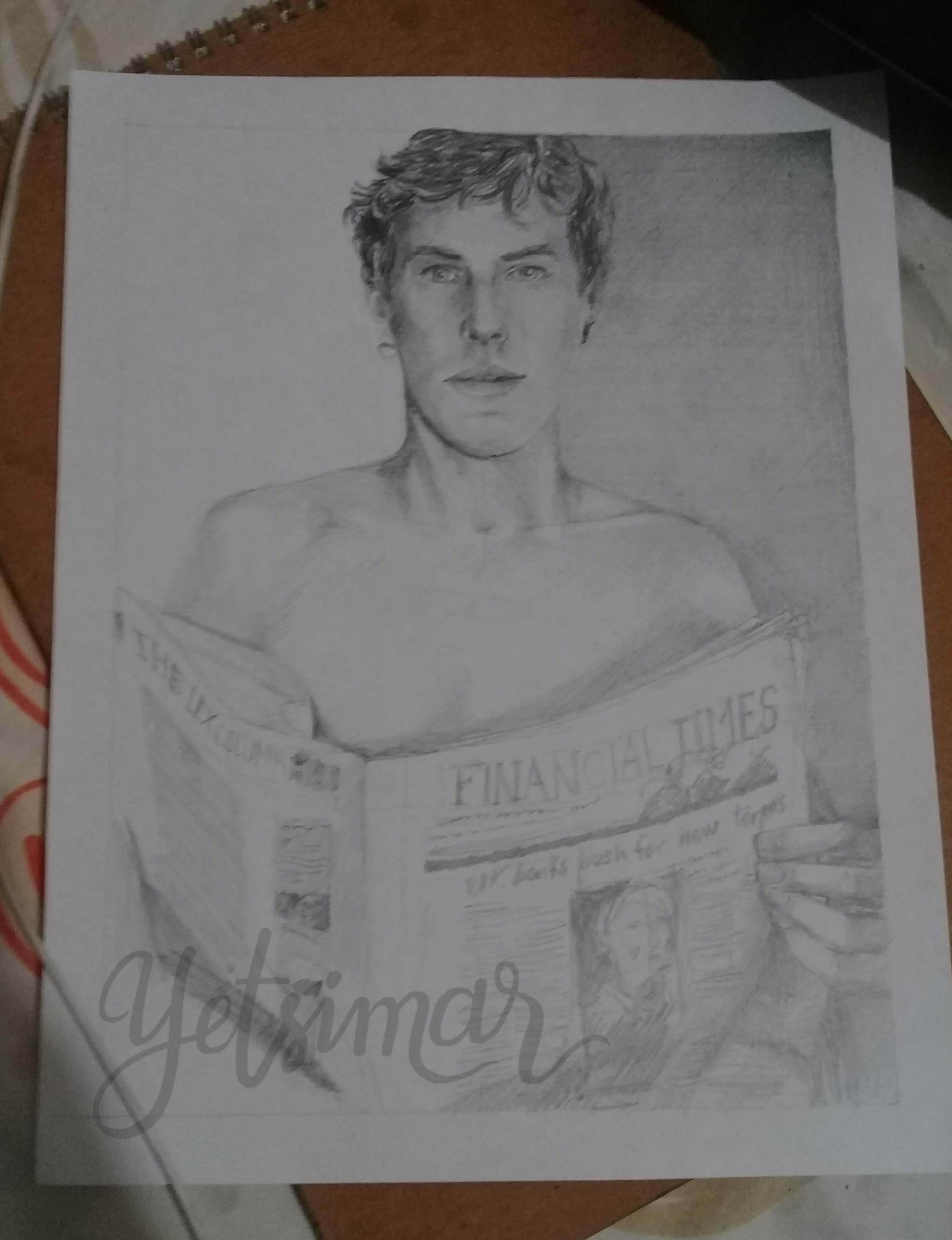 Hola! El retrato número cinco de esta serie consistía en realizar al ídolo seleccionado sin camisa mi primera opción fue realizarlo en una escena de la película Doctor Strange, pero no logré encontrar una imagen de buena resolución de dicha escena razón por la cual preferí una en la que el actor se encontraba en lo que parece un pub leyendo un periódico y decidí tomar esta foto para el dibujo.