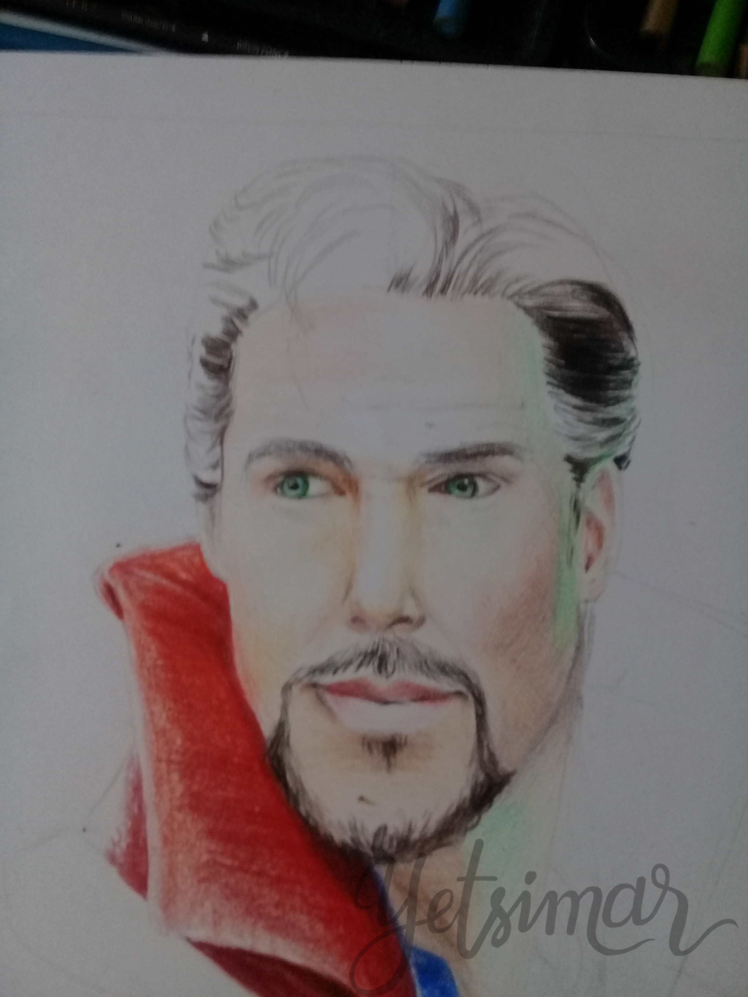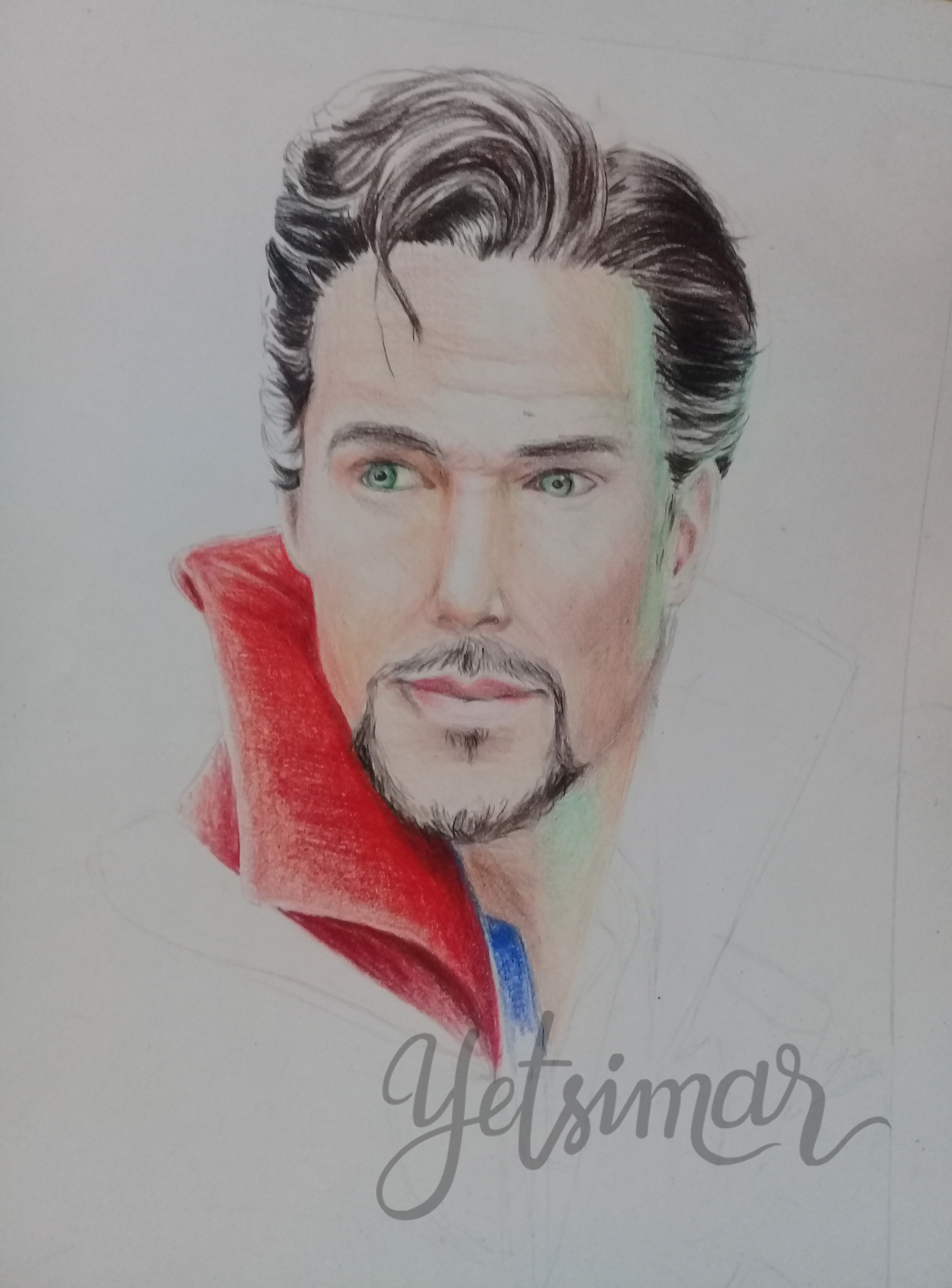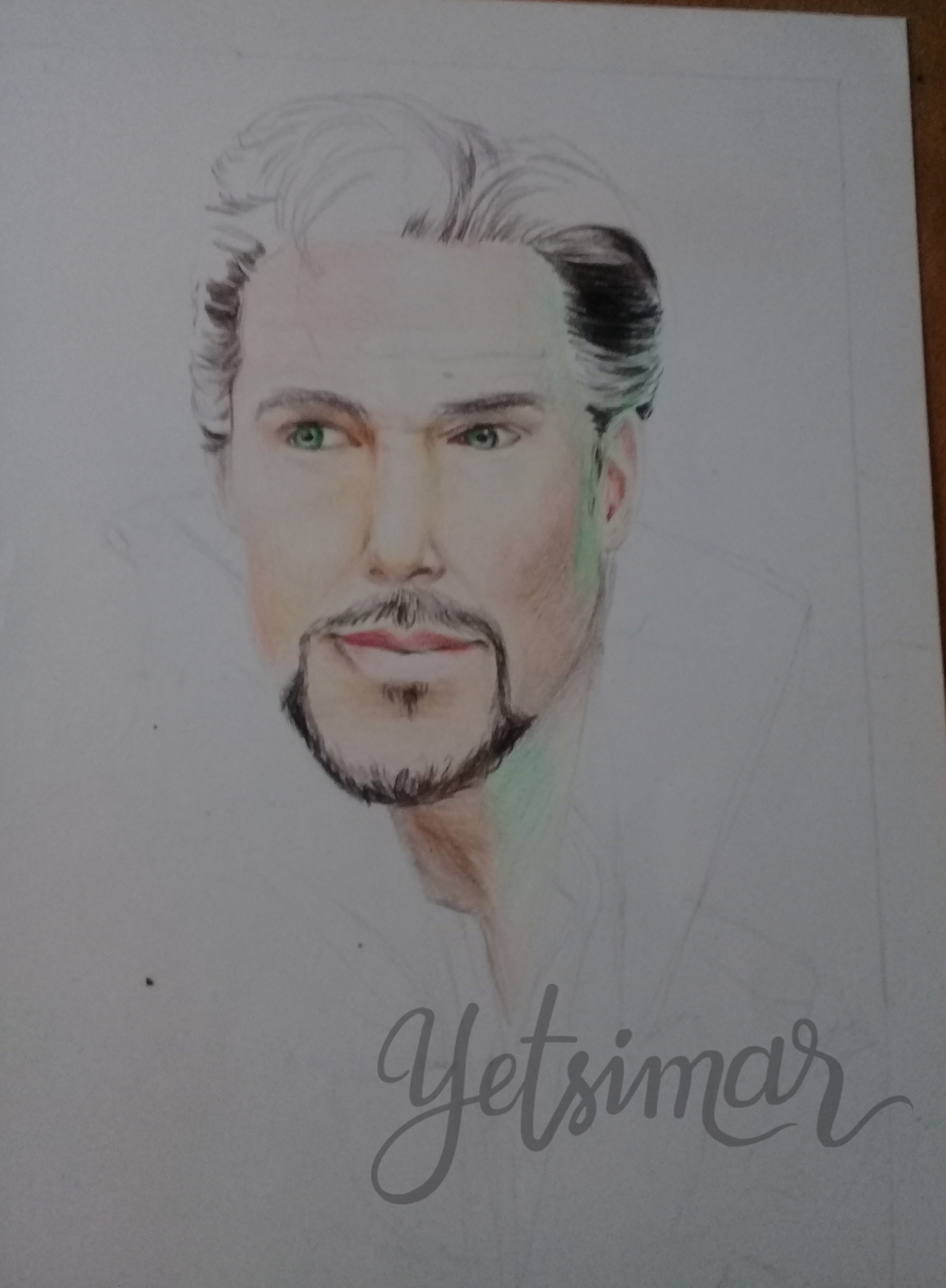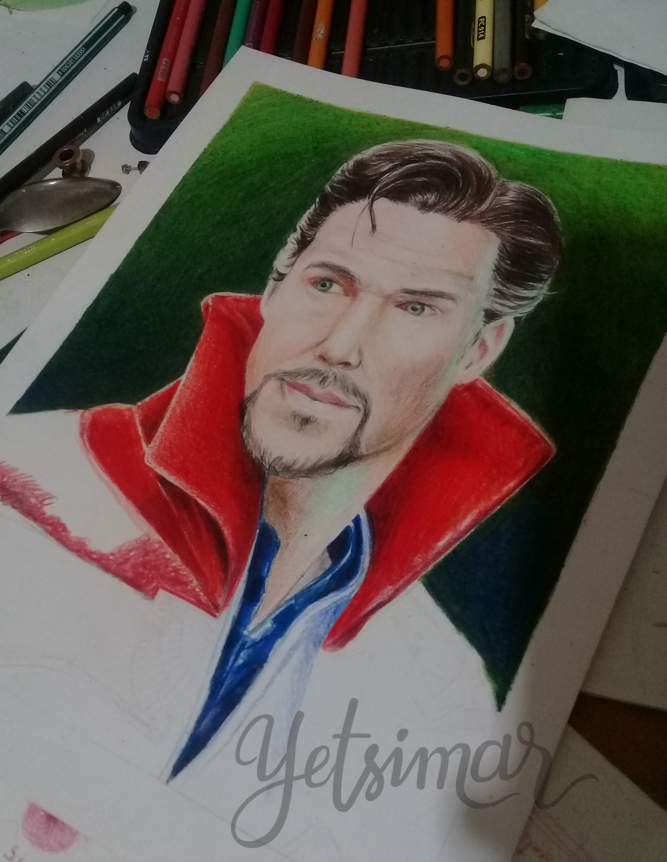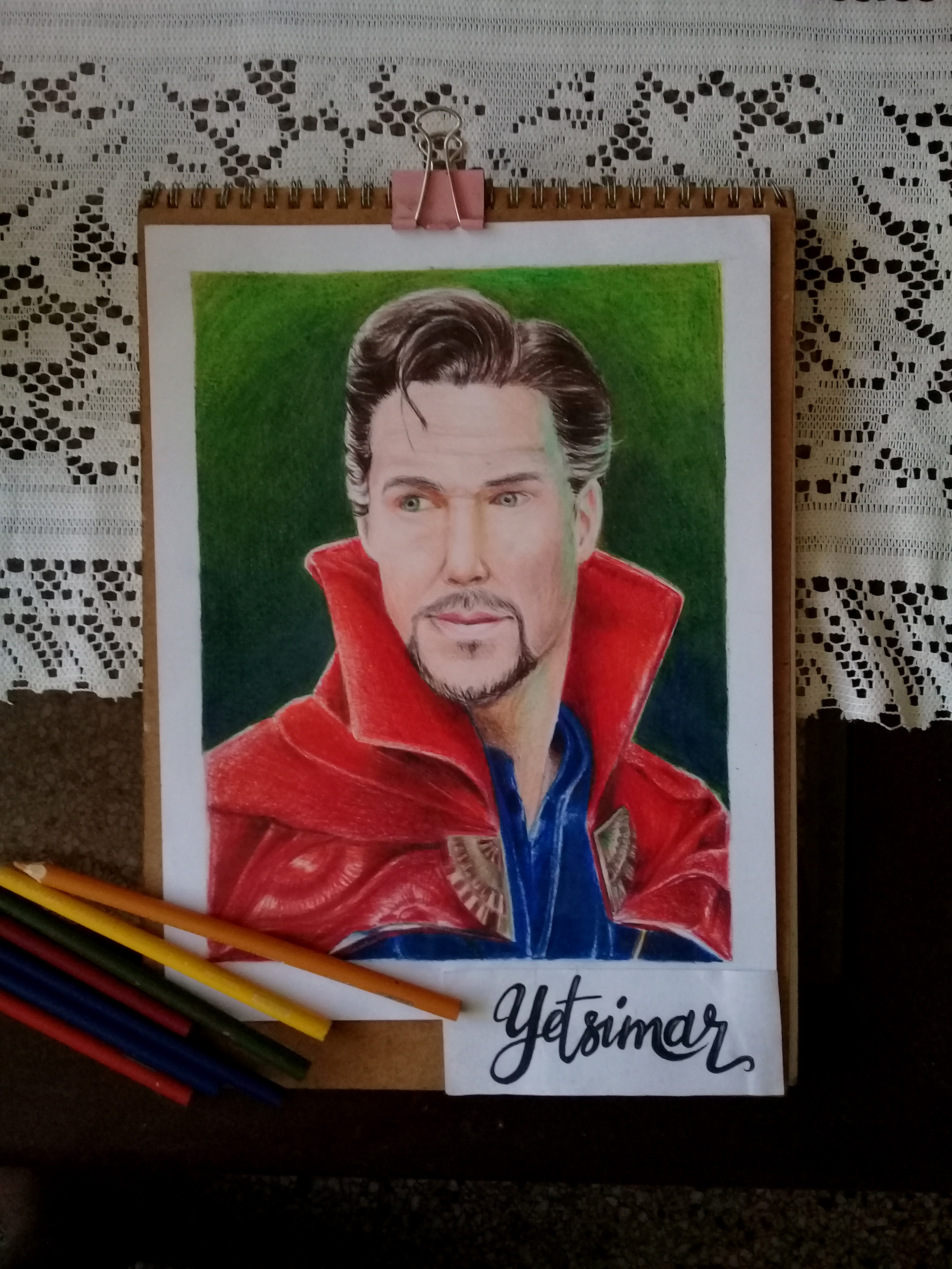 Para el retrato numero siete de esta lista decidí dibujar al artista en uno de mis personajes favoritos en el que personifica al Doctor Strange, el Hechicero Supremo del Universo de Cómics Marvel personaje que tiene un gran dominio de las artes místicas, debido a variedad de colores que presentaba tanto el traje y por lo que representa decidí abordarlo usando lápices de colores.