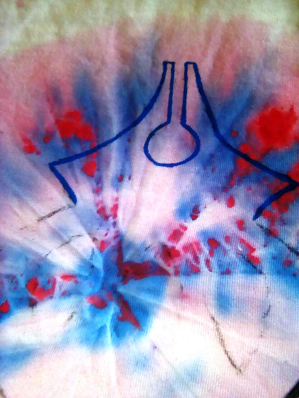 - 1 Franela, pintura de tela azul y roja , lentejuelas azules y canutillos transparentes, hilo, papel y cartulina.
