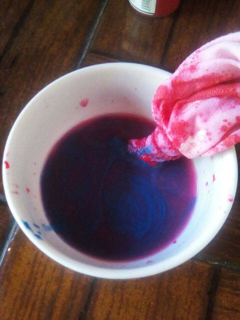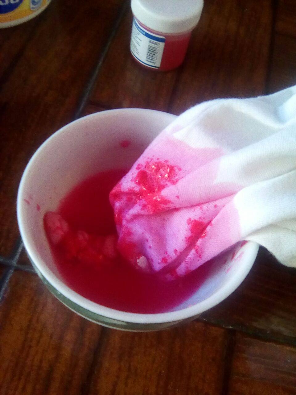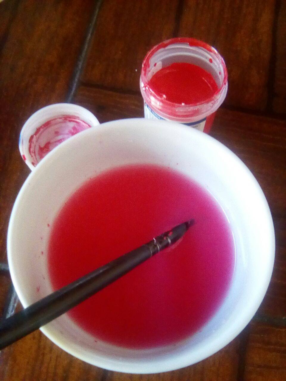 - En un pote, agregue un poco de pintura de tela color rojo, y metí la parte que enrolle para pintar.