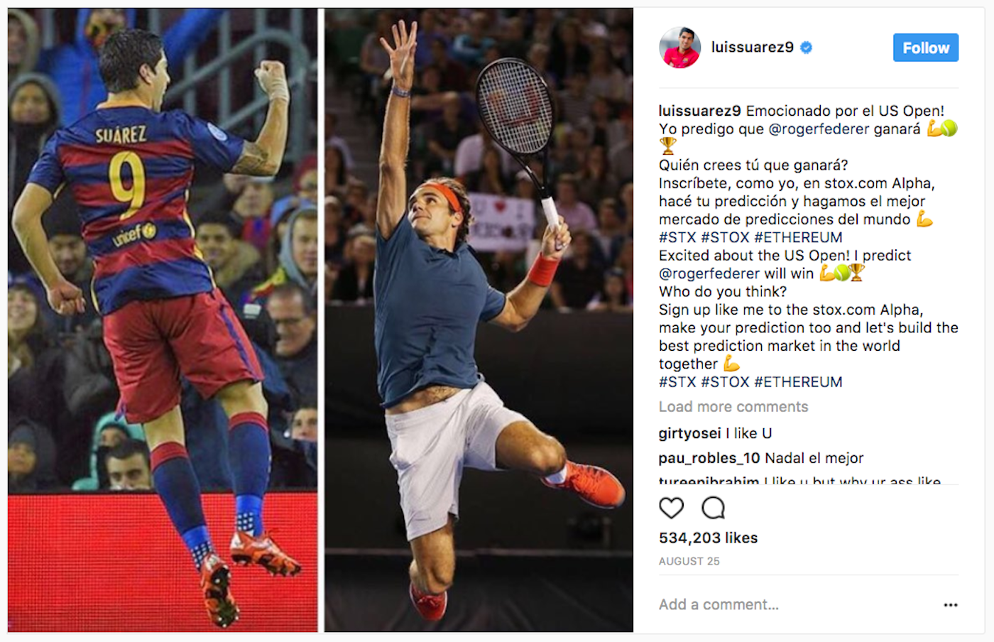 Luis publicó en su cuenta oficial de Instagram el 25 de agosto del 2017 apoyando a su amigo Roger Federer (tenista) quien estaba disputando el U.S. Open y aprovecho la oportunidad para hábilmente pedirle a sus 24,2 millones de seguidores que se inscriban en Stox.com para ayudar a “construir el mercado de predicción más efectivo en el mundo”.