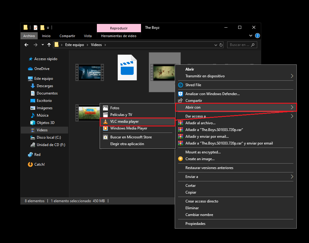 Si es la primera vez que usaras este reproductor puedes hacerlo dando clic derecho a tu archivo de vídeo y escogiendo "abrir con > VLC media player", si no sale en la lista principal puedes dar clic en "abrir con > Elegir otra aplicación" y buscarlo en una lista de programas de tu computadora.