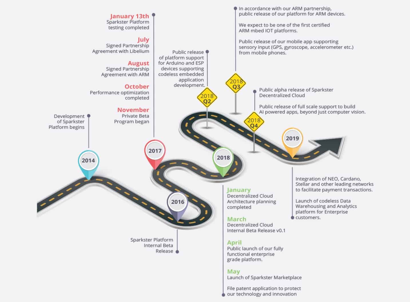 According to roadmap development on Sparkster platform began in 2014, since then the team released an internal beta and gained few partnerships. In Q2 now and at Pre-ICO with public release of the platform supported for Arduino in Q3 with public release of platform in Q4. Its probably the most anticipated public release of Sparkster decentralized cloud In 2019 where the project will then focus on integration's with other blockchains.