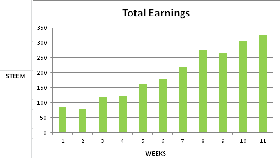- earnings of 320+ STEEM per week and growing every week