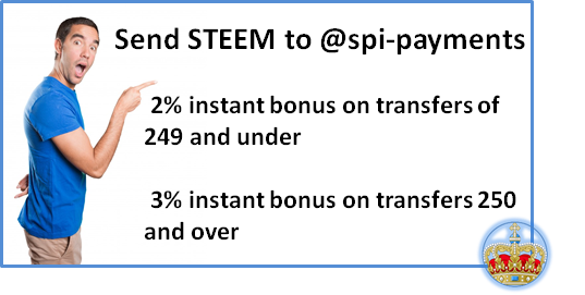 What about for the next 3 days anyone that sends STEEM to @spi-payments receives a 2% instant SPI bonus on transfers under 249 STEEM are 3% for transfers over 250 STEEM. Yep, you heard that right for the first time ever you can get free SPI tokens for buying SPI tokens. No waiting until the buyback wall is finished, get them instantly.