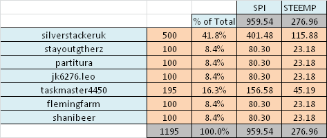 First off, big huge thank you to the members that helped with this. We collected 1195 STEEM, bought back 959 SPI tokens and have 259 STEEM left over. I have done a very quick excel table to show how things are looking and what everyone is owed.