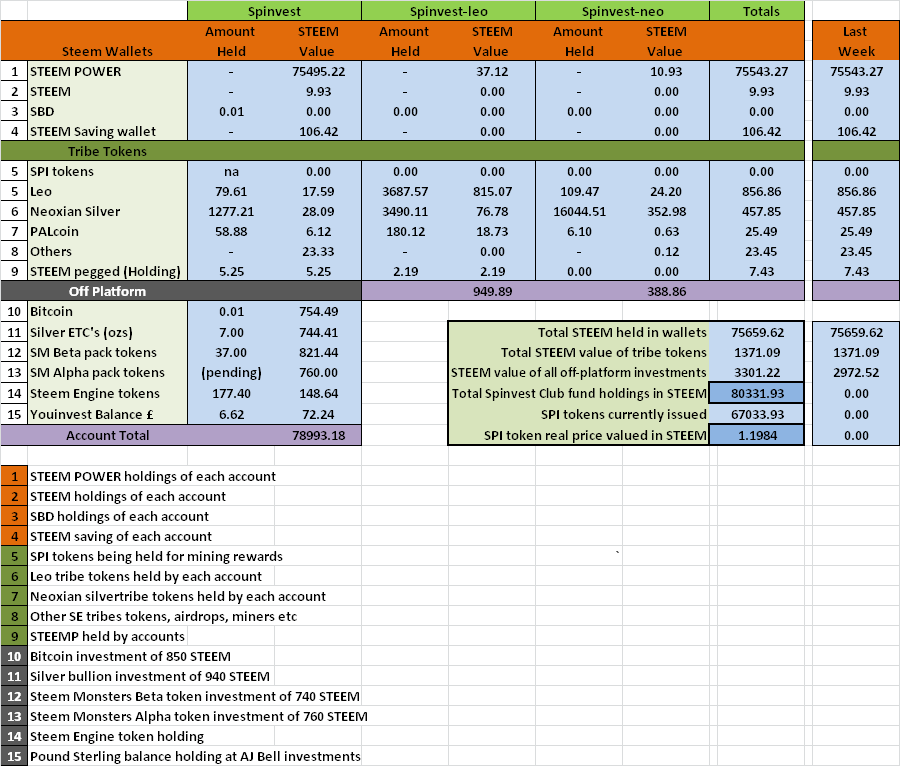 Below is a complete list of everything that @spinvest owns. You'll notice that this week the holdings have been updated to include both of the tribe accounts for SteemLeo and Neoxian. You can now see what their steemit and SE wallets contain and more information is always better. The column labeled "Last Week" is set for next week so please ignore those numbers this week please.