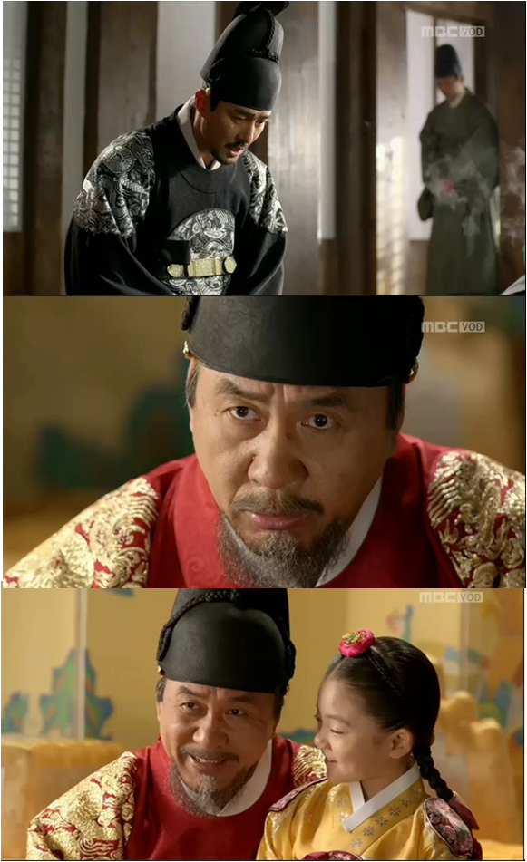 Gwanghae kneels down in front of his father Seonjo (Park Young Gyu). The king is furious because of a message which Ming doesn't approve of Gwanghae’s status as Joseon’s crown prince again. He is about to explode, but little Jungmyung (Heo Jung Eun) bursts into the room and he feels better.