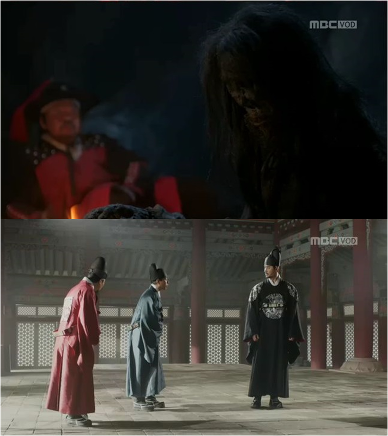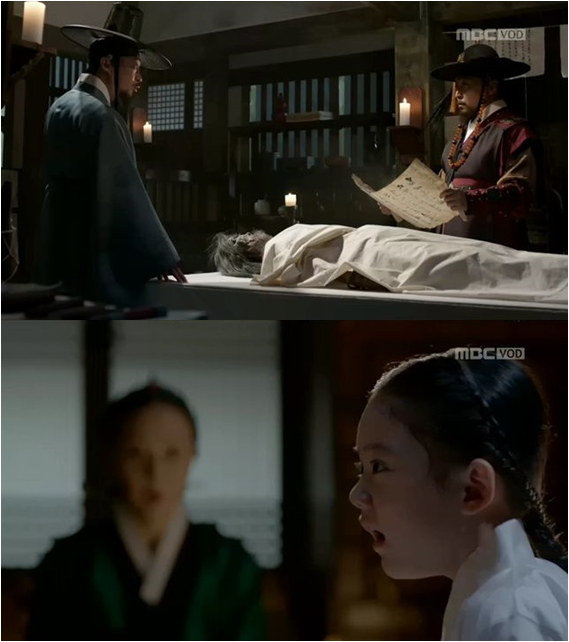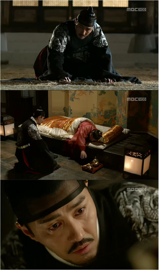 Gwanghae feels anger thinking how his sincere efforts were totally ignored by his father. He goes inside the king’s bedroom despite of attendants blocking his way. He finds the king is in a critical condition and shouts to get a doctor. The attendants all left to fetch the royal physician and Seonjo is under his care. When the father asks Gwanghae to give him water, he doesn't give him water coldly saying it will add pain. The next king calmly promises that he will be a completely different king from Seonjo.