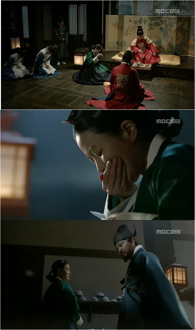 The king’s attendant Kim Gae Shi (Kim Yeo Jin) takes a sip of the medicine for the king. She rushes to the kitchen to bring out her medicine but she starts to cough out blood. Yi Cheom is there waiting for her, congratulates her for doing a good job.