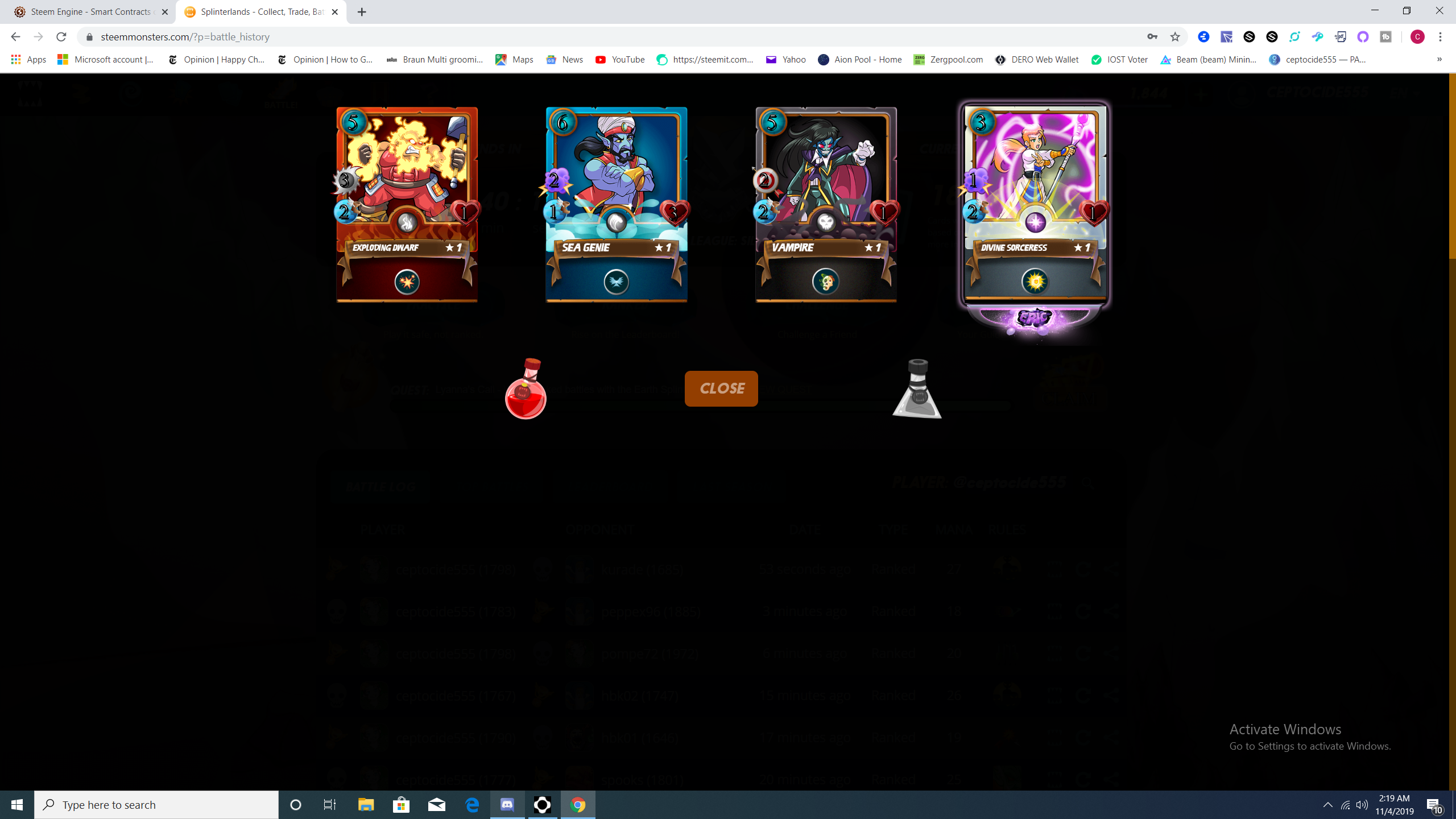 Reward Cardsceptocide555 (55)in #splinterlands • 6 years ago Everyday grinding out my dailies to streghten my deck. My only gripe is most of the reward cards i get are kinda useless and not that great. #palnet #steemace #battle #spt