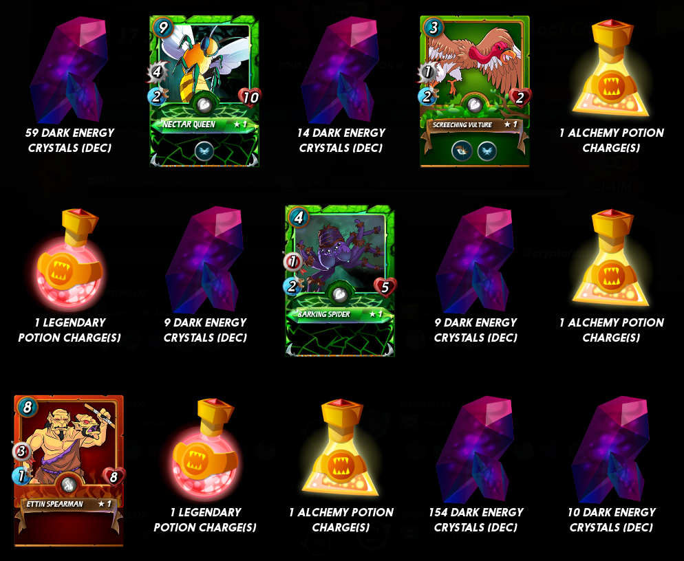 Welcome to the 446th round of Splinterlands giveaway! I have got into the Champions 3 League for almost a week until the end of the season, and that's awesome! Maybe there is a chance to get into Champions 2? Maybe in a couple of weeks :) I've got 16 rewards for opening my daily quest in Champions 1 league (the last one was DEC, so I cut it off from my screenshot... lol...)