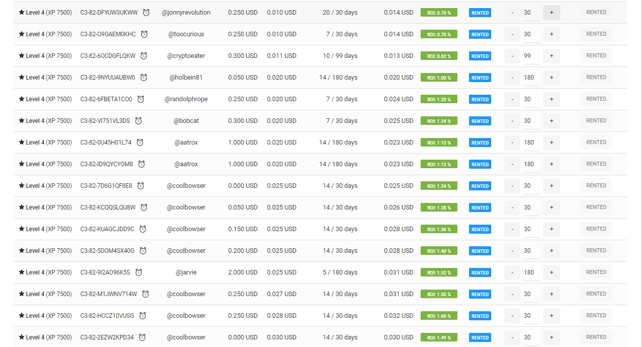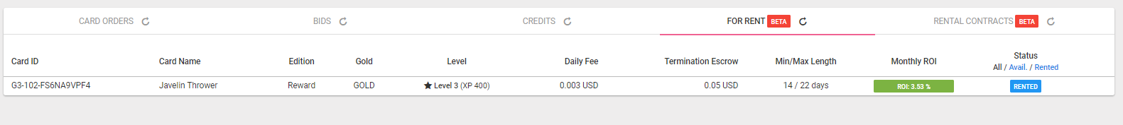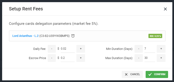 If you refer to the image above you notice that the cards that have been rented have a daily fee raging around 0.02 - 0.04. However, note the escrow fee as well. That is a secondary fee where you can earn something extra from your card.