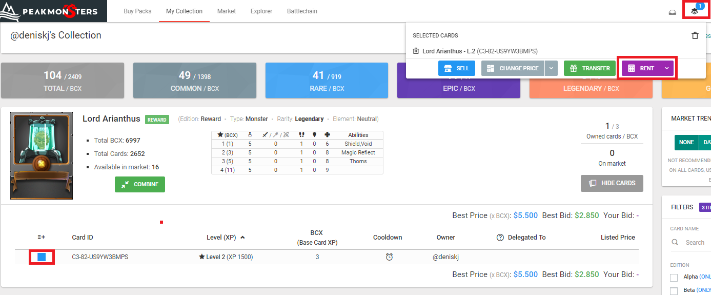 Renting out my first Splinterlands card on Peak Monsters.