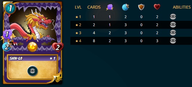 Shin-Lo: Available only during the October 2018 Kickstarter, Shin-Lo is one of the scarcest cards in the Splinterlands universe. With 225 regular bcx cards in existence and decimated down to a combined 113 in circulation, the top 25 players have been using it less than 1% of the time, but with a win rate of 69%. Dragon 1 mana magic sneak is incredibly powerful, though quite expensive to level up! Dragon splinter quest should see revived interest in some of the early Dragon cards. Regardless of new cards or abilities released, the legendary Shin-Lo should always have a use in Dragon and remain a classic card.